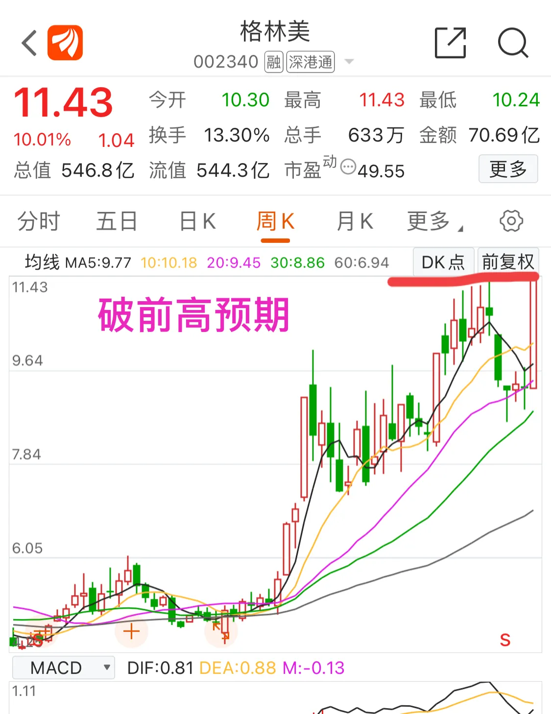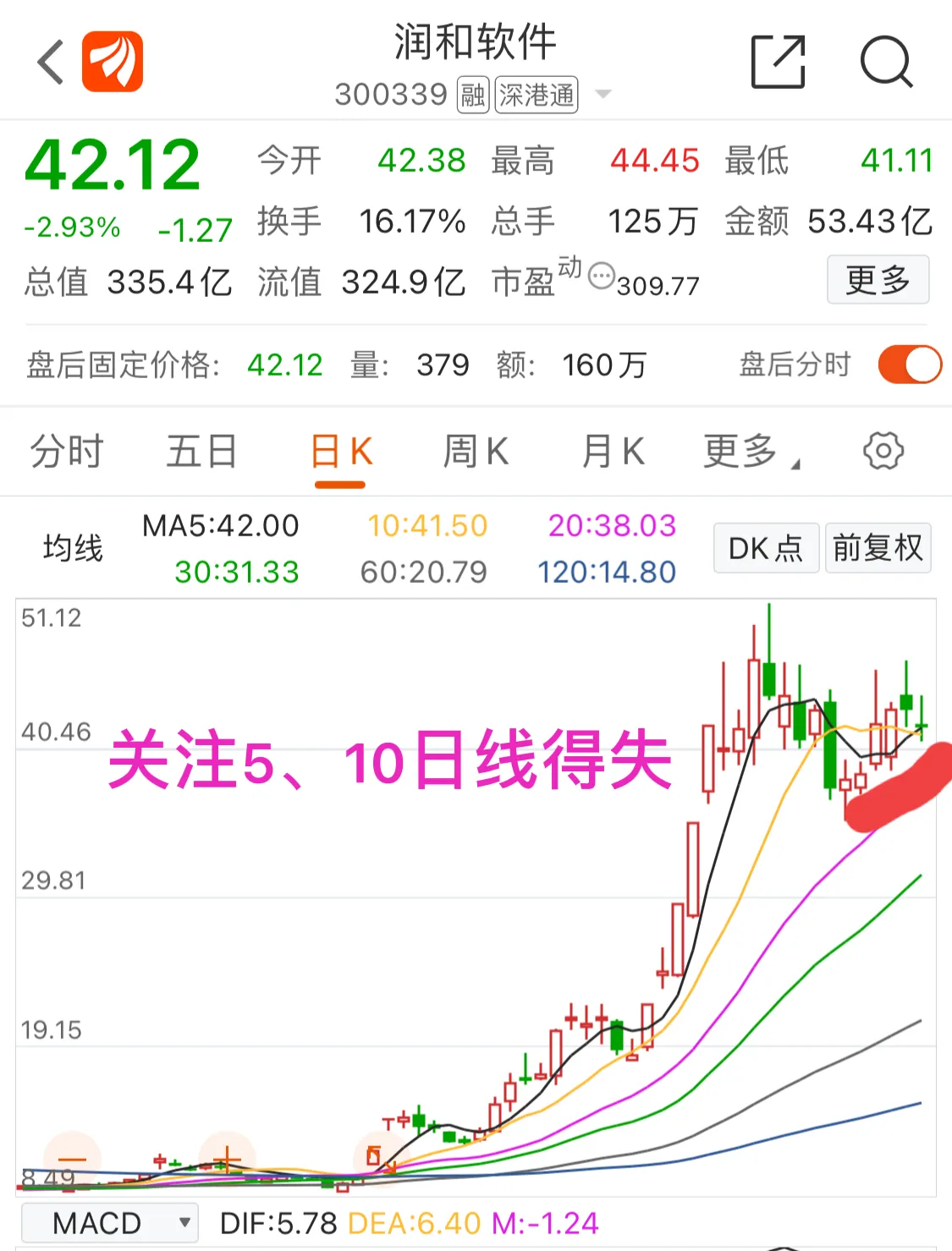 4.润和软件:临近变盘点,这里已经震荡好几天了,下周会变盘,关键看能否继续在5、10日线上方继续强势,如果站稳不排除走第二波的可能,关注分时承接力度!