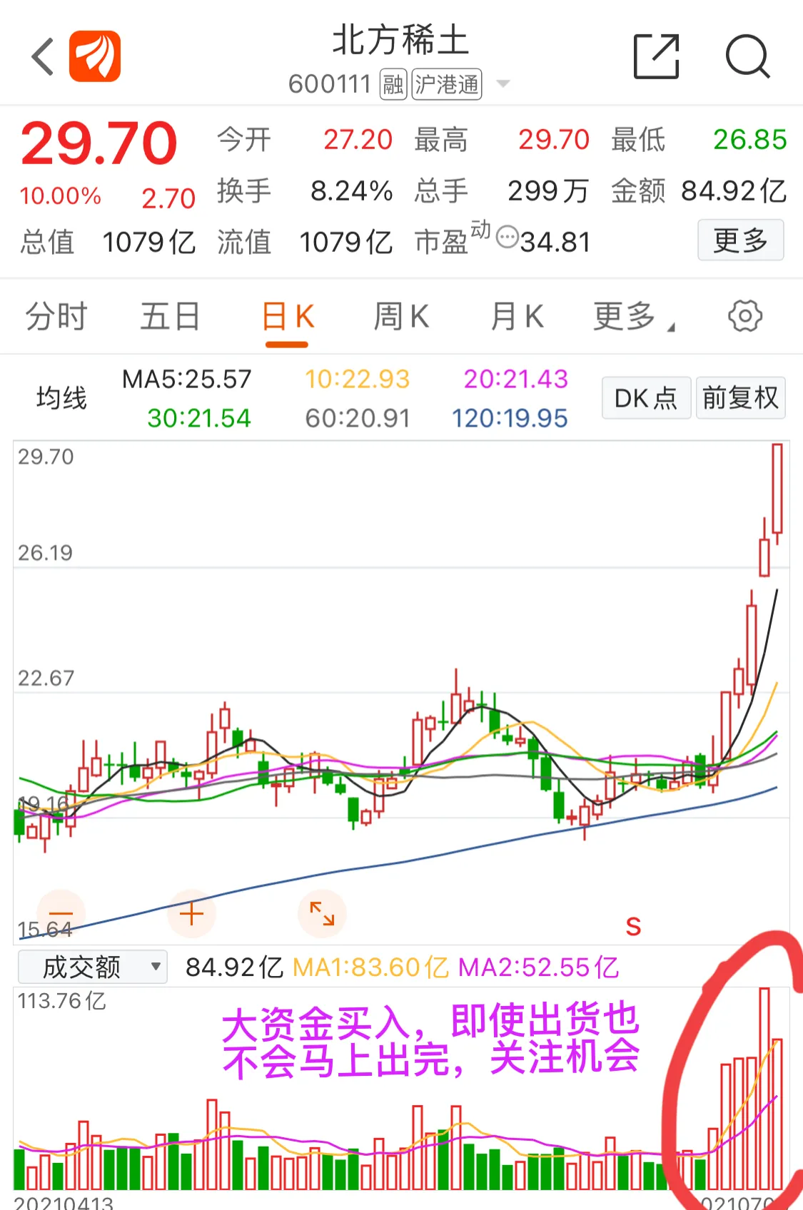 3.北方稀土:机构大买20+亿,这里资金介入很深、可以肯定的说这里不是顶部!而且这里出货也出不完。但短期各方机构大手笔买入,轿子较重,可能有反复,震荡走高。