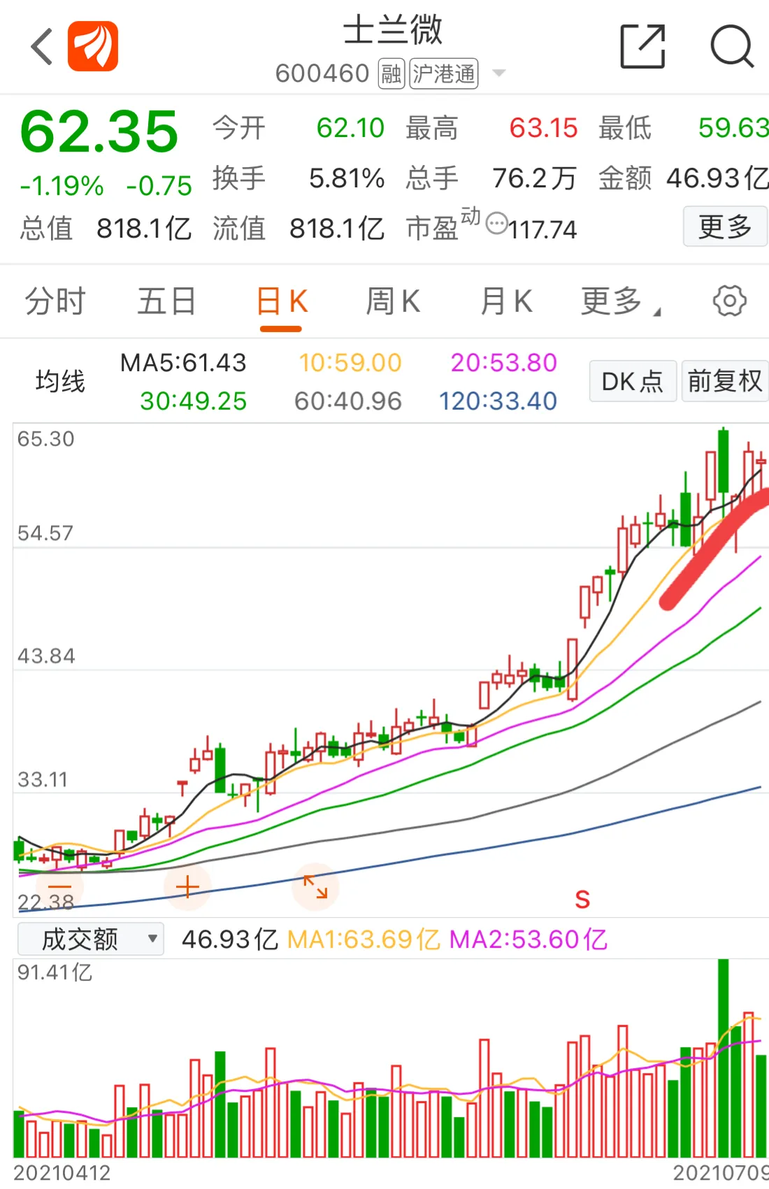 5.士兰微:0706放量一根绿巨柱,说明有资金已经出逃,不过周五缩量调整,走势还算健康,趋势还在,在5日线上方强势新高就没问题!
