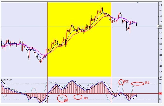 3,MACD在使用中可以配合KD指标使用,可以有效增加胜率。比如MACD零轴下方运行,KD超买后,配合k线形态做空,反之亦然。
