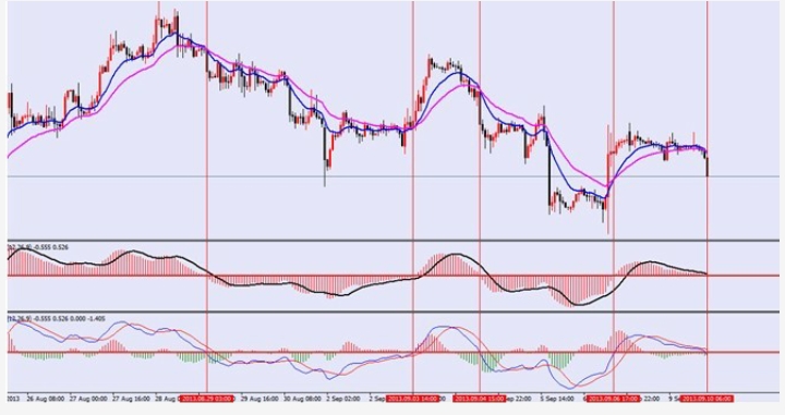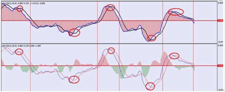 上图主图中,蓝色为12期EMA均线,粉色为26期。上图中四道竖线位置分别为两均线死叉和金叉的时刻。投资者要注意到下方,是两个MACD,第一是单线的,第二个双线的,虽然外表大相径庭,但是透露出来的信息是一样的。
