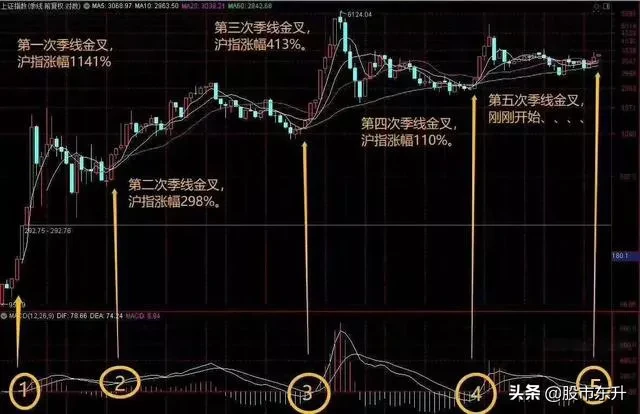 4.从大盘季线图看,当前已经形成历史上的第五次金叉,第一次季线沪指涨幅1141点,第二次298点,第三次413点,第五次才刚刚开始,时间周期上,07年大牛,14年大牛,七年一循环,那么这次是什么时候?你品,细细品。