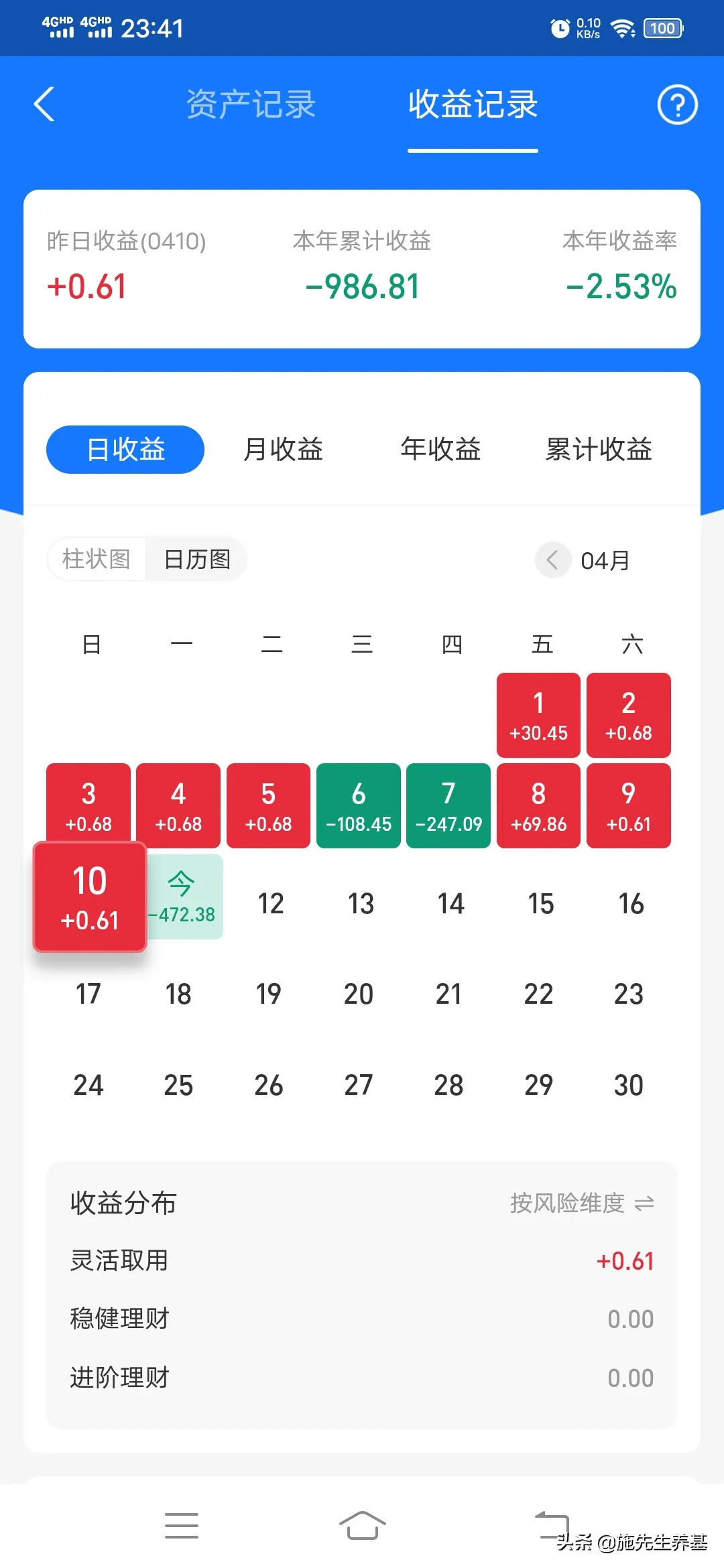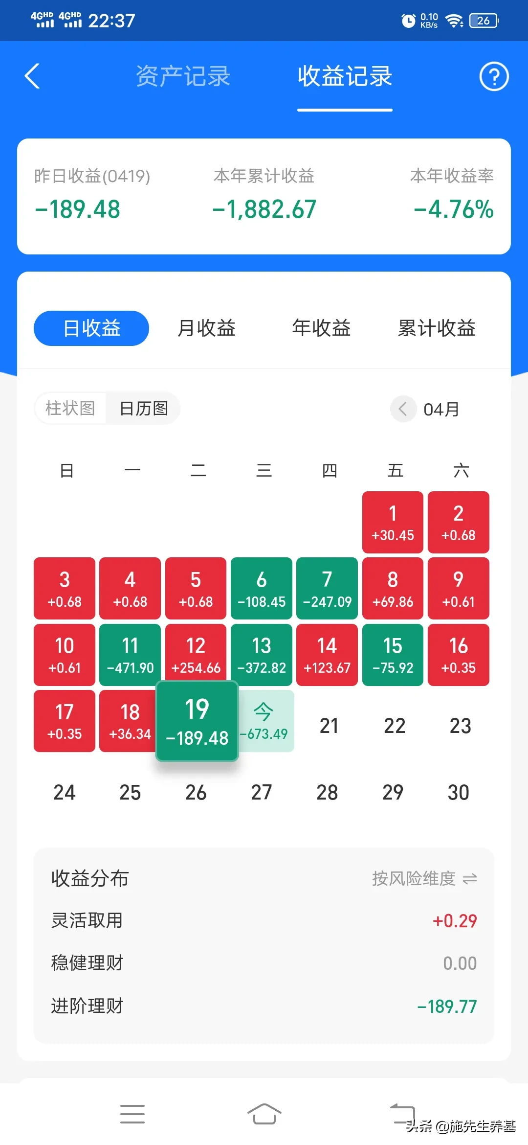 如今市场哀嚎一片,基本一致看空市场,很多人说大盘要跌到2800点才是底!这是不理智和不科学的。施先生这次要坚决一点反人性一点,明后两天大盘都收中阳线,收涨1个点以上。如果不是我决定清盘玩美股去,此贴为证,其实我很想清盘玩一个板块,反正亏的不是多,下不了决心。看本周最后2个交易日大A是否挽留我了,哈哈!看下我的收益率3月20号还是红的正收益,自从4月初建仓创业板的半导体和光伏板块开始变绿,1周后割肉这两个板块到现在收益率越来越绿了。还是管不住自己的心,本来一直好好的,干嘛去玩创业板,都变失业板了。好了,粉丝们记住了,如果大盘这两天没有收中国红到时候提醒我,我要坚决清仓玩美股去。