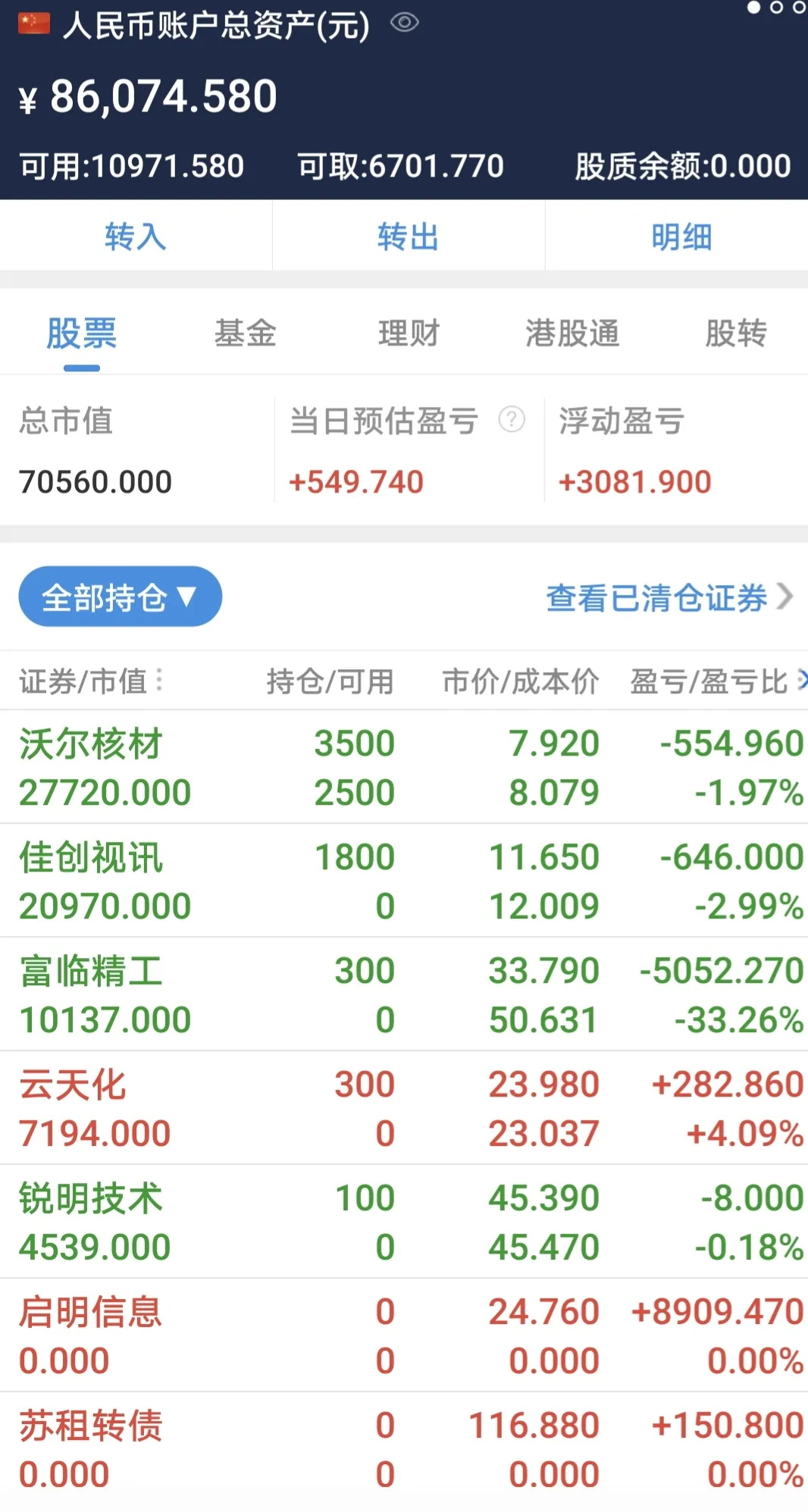 每日实盘更新,11月10日盈利549元,总资产为86074元(2021年木金210000元)今年总亏123926元,股市真是一个神奇的地方,那怕亏了好多钱,还是让人乐如此不疲。