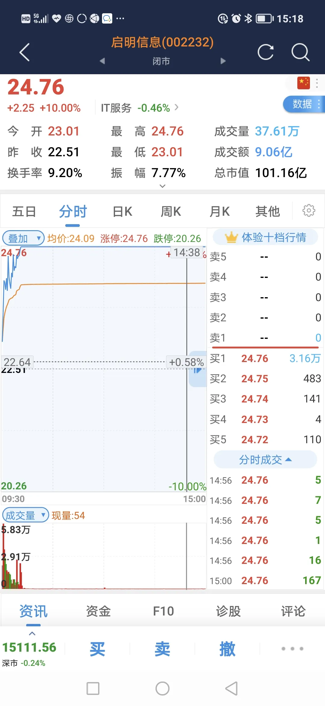 很快时间转眼到了9点35分,股票还是很强势,大单不断的买入,这时股价已突破24元了,我还是想着启明信息今天还会跌,毫不犹豫的,又以24.14元卖掉了最后的三百股。