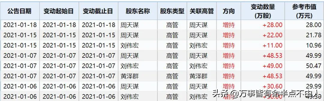 数据显示,截至1月18日,刘伟宏、周天谋分别累计增持110万股、129.13万股,另一位高管黄泽群累计增持48.53万股。期间3人累计共增持287.66万股。