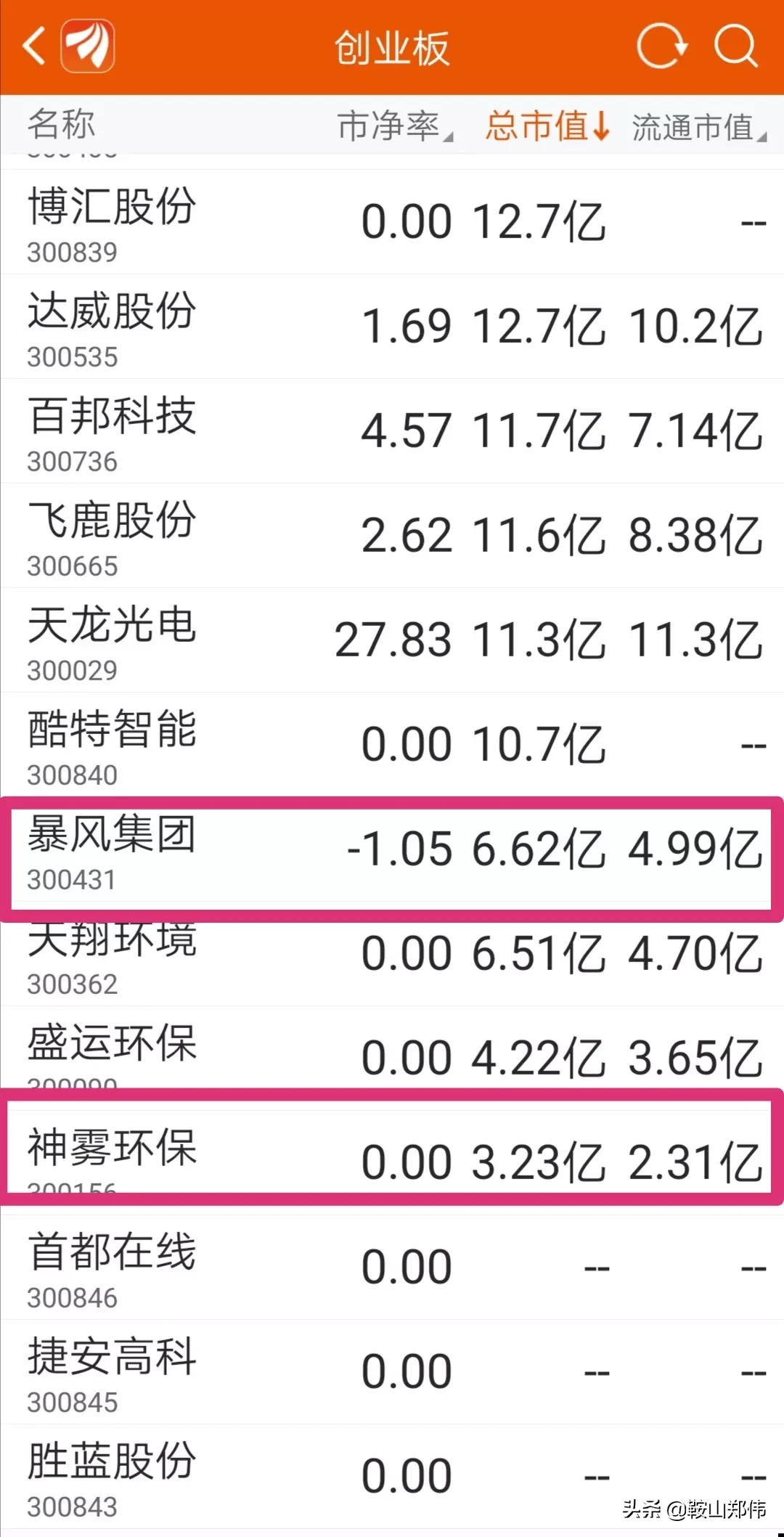 截止2020年6月12日创业板总市值最低的是神雾环保3.23亿元(见图4)。暴风集团总市值6.62亿(见图4),要跌去54.74%,才能满足强制退市条件。