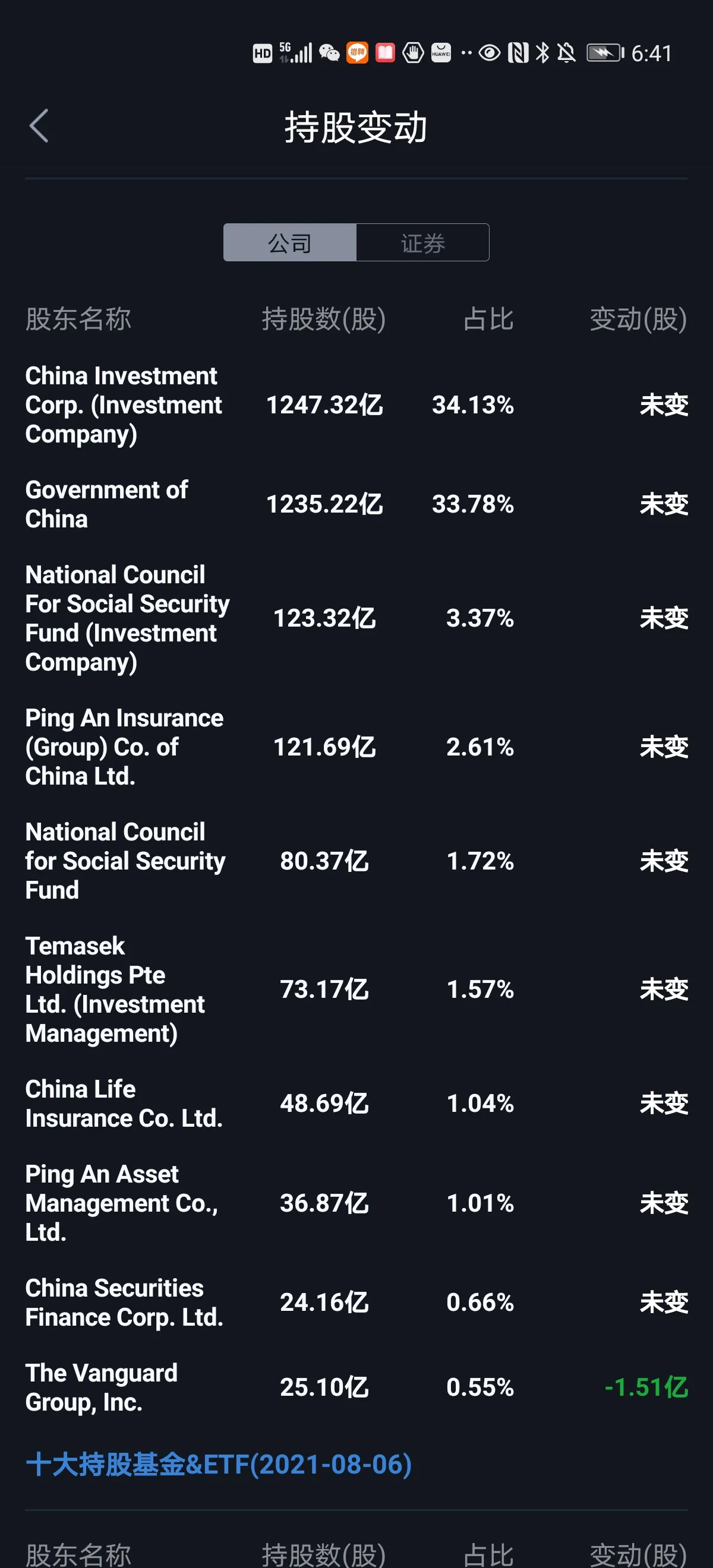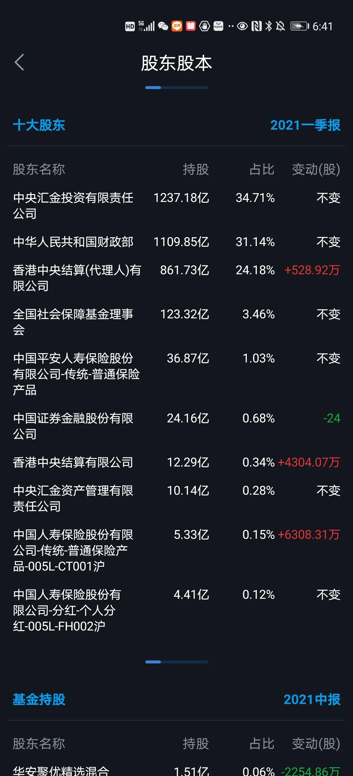 比如,对于工商银行A股,平安人寿和中国人寿两个账户分别列一季度未工行A股第四丶第九、第十大股东,合计持股约45亿股,按今天收盘价,持股市值约210亿元人民币。