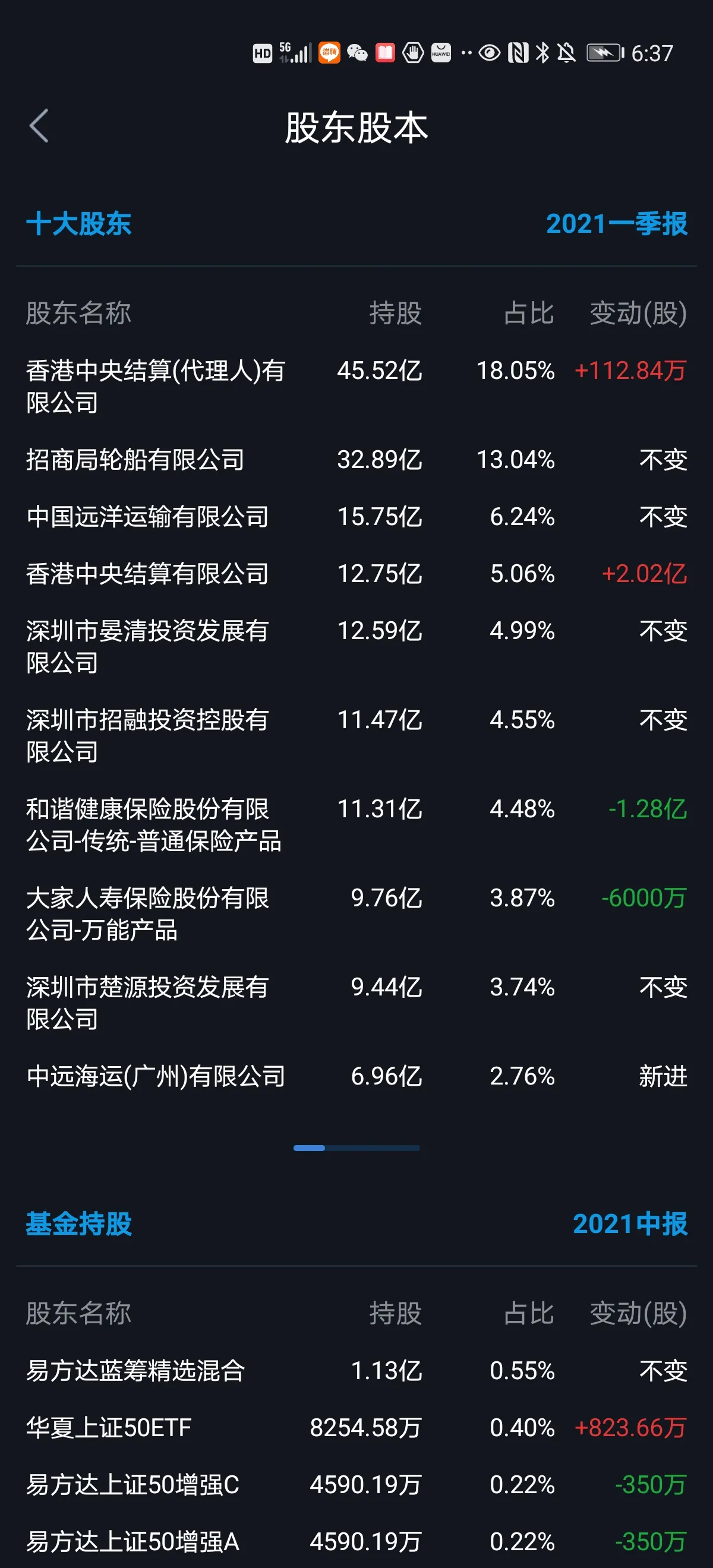 比如,对于招商银行A股,和谐健康和大家人寿分别列第七、第八大股东,合计持股约21亿股,按今天收盘价,持股市值约1070亿元人民币。
