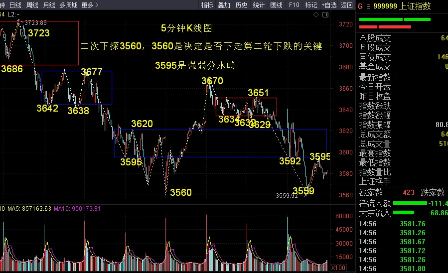 5、大盘二次下探3560点,暂时获得支撑、3595为强弱分水岭,跌破3560点为三卖确认信号。