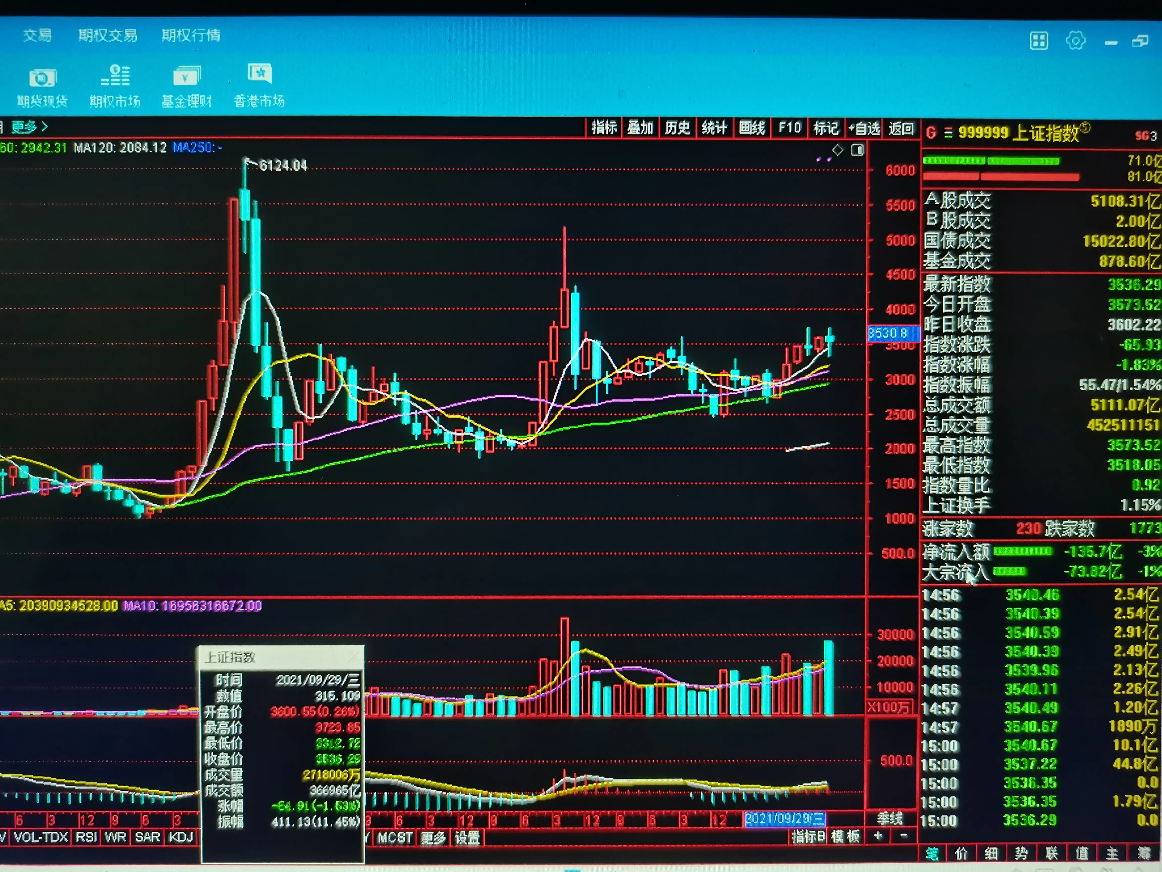 中秋过后的六个交易日大起大落,尤其是最近几天屡屡上演小型股灾的画面,动辄一两百只股票跌停,昨天更是有近90%的股票下跌。本月初的时候我就提出上证指数月底收盘在3600以下的预测,即使是中旬涨势凶猛眼看要超越3731创新高的时候也未改变预判。对大盘指数的预判不仅仅是第二天的涨跌,有时周线月线甚至季线同样会给你指明方向。