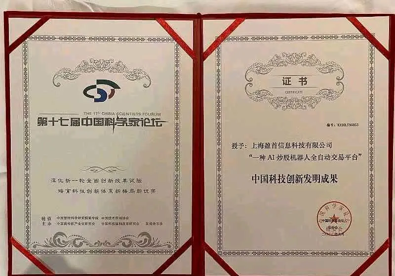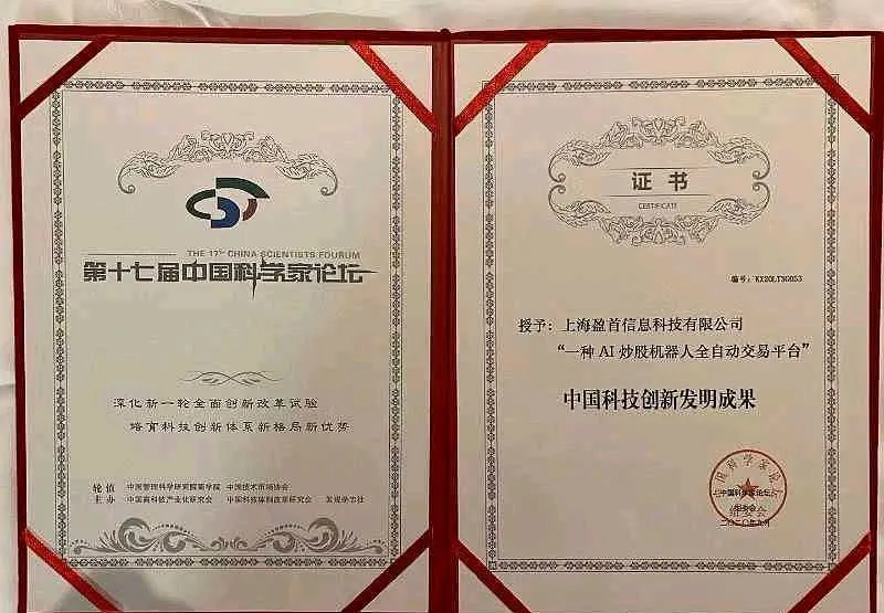 《盈首AI炒股机器人全自动交易平台》获得“中囯科技发明成果证书”!