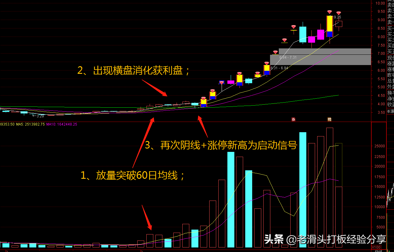 1、突破时量能超过前面的量能,反复放量+阴线组合+涨停。