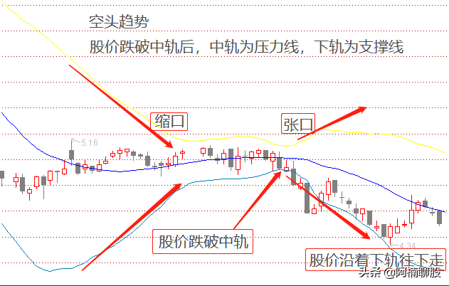 3、缩口再张口,股价跌破中轨,沿着下轨往下走。如果中轨线向下拐头,就说明行情非常弱势,应该及时规避下跌风险。