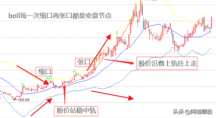 1、缩口再张口,股价站稳中轨,沿着上轨往上走。布林带张口越大,单边波段行情也就越大,如果中轨线也向上拐头,那行情会更加强势。