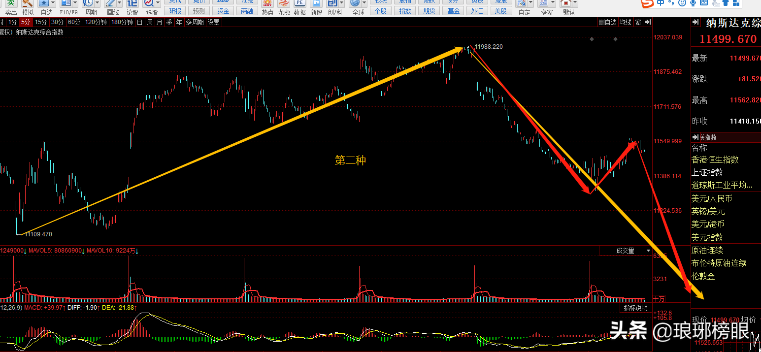 2.对于现在纳斯达克的走势,如图下分析,大方向依然看空啦,但是这里面有变化,到不是榜眼哥喜欢二头堵,确实对于小级别趋势,经常有一些政治经济消息干扰,而大级别的走势是很难改变的,目前美股的走势依旧是下跌中继。