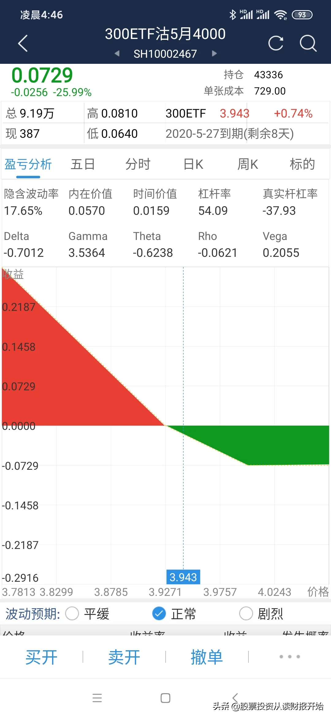 那初学者会问,604元是什么。这里我给大家普及一下,3.9元认购期权。权利金有两部分,第一行权价格也可以称内在价格。理论上期权交割日,5月期权交割日为下星期三。平值期权会规零,那么3.9的认购期权内在价值就是3.943-3.9等于0.043。也就是430元,那174元是什么?可以称为时间价值