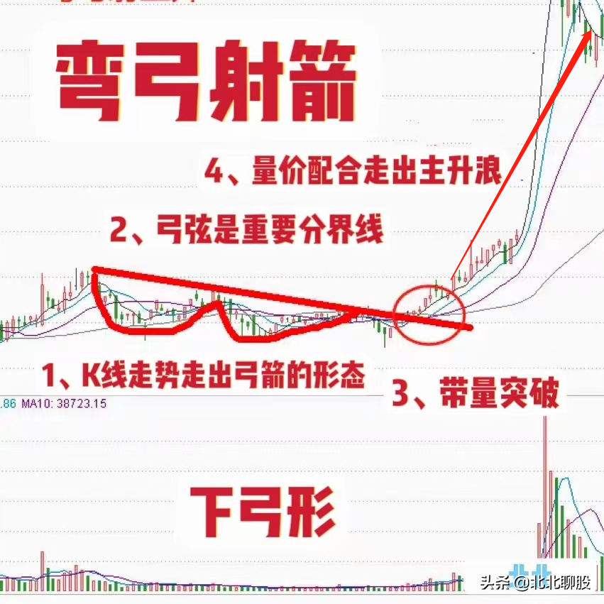 以上就是北北总结的“弯弓射箭”形态的特征以及技术关键点,大家要注意配合量能一起操作,量价配合得越好,后期的反弹幅度会更大。