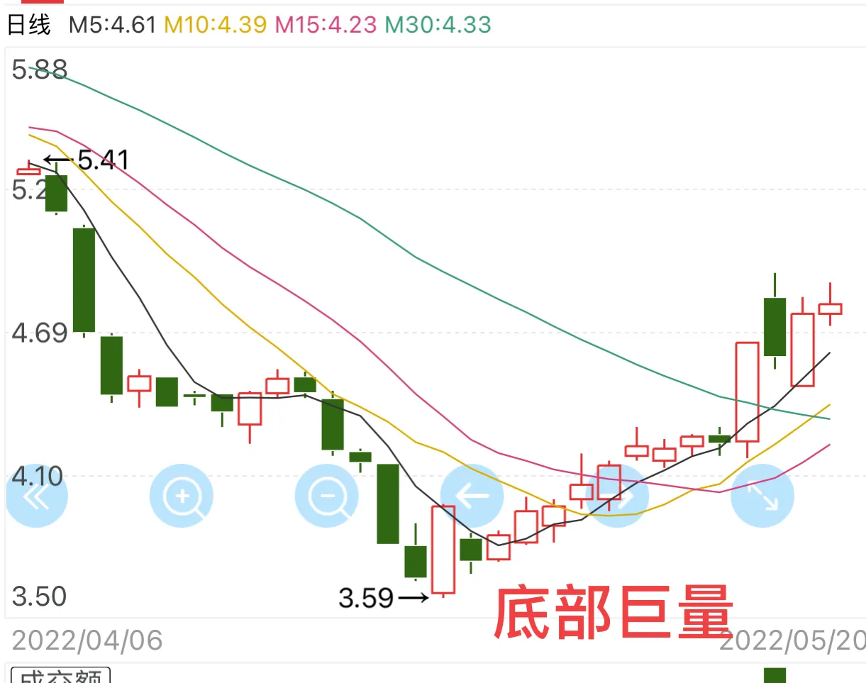 1、 底部放巨量:底部放巨量意味着股票开始资金关注,或者主力开始充分吸筹码准备改变方向,准备开始上涨或者酝酿资金的阶段。但底部巨量出现之后继续盘整的案例居多,这时候要关注是否在盘整过程中再次跌破巨量阳线的底部作为一个参考的依据,但不能作为立刻买入的依据。