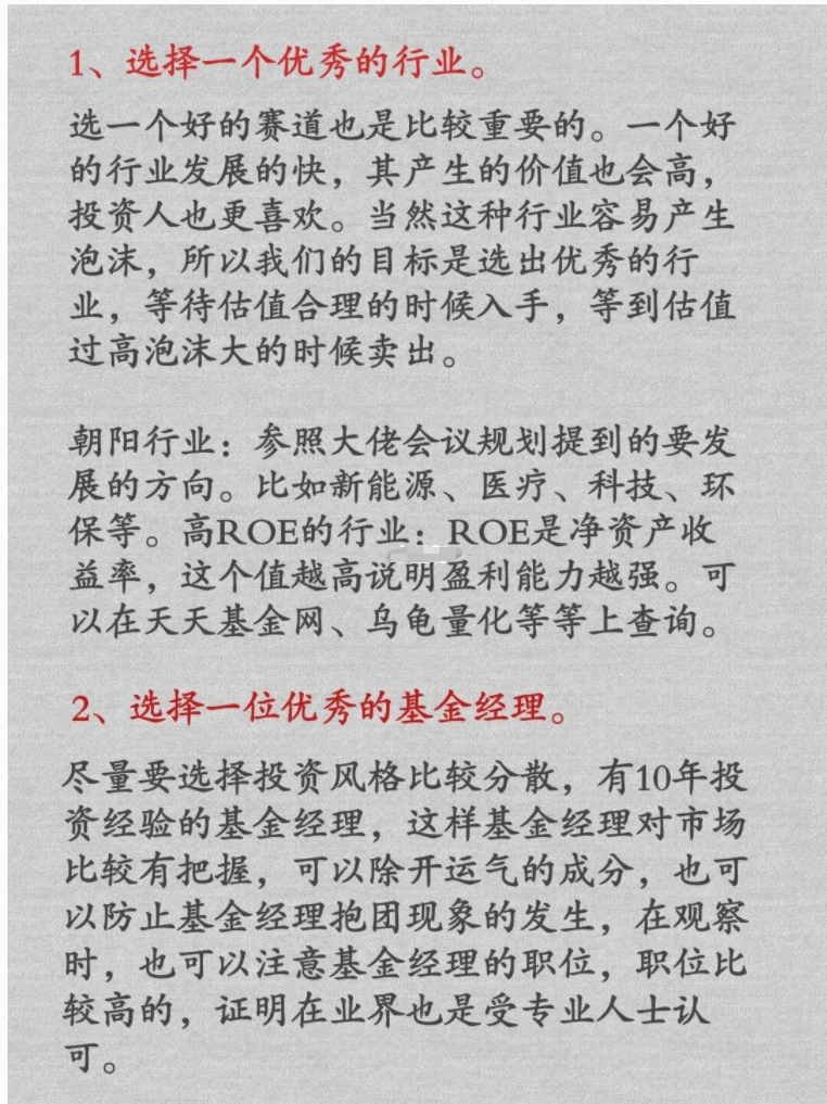 朝阳行业:参照大佬会议规划提到的要发展的方向。比如新能源、医疗、科技、环保等。高ROE的行业:ROE是净资产收益率,这个值越高说明盈利能力越强。可以在天天基金网、乌龟量化等等上查询。