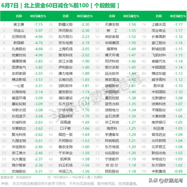 近一个季度北上资金卖出最多个股名单:奥士康、祁连山、庄园牧场、新国都、丸美股份、地素时尚、福耀玻璃、思源电气、志邦家居、横店影视、一心堂、台海核电、瀚蓝环境、赛轮轮胎、华新水泥、东旭蓝天、长城科技、华夏航空、聚光科技、九强生物、华宝股份、浙江美大、光大嘉宝、海尔智家、杰瑞股份、新疆火炬、洋河股份、东方网力、安车检测、上海机场、雅克科技、浙江永强、伊利股份、康力电梯、云南白药、润和软件、建发股份、浦东建设、东方日升、宁波华翔、亿联网络、深高速、口子窖、国药一致、天邦股份、傲农生物、千禾味业、凯莱英、白云机场、华润三九、天康生物、柳 工、帝欧家居、华闻集团、福莱特、博天环境、同济科技、鄂尔多斯、远光软件、首旅酒店、继峰股份、中国国旅、重药控股、蓝色光标、涪陵电力、金石资源、华工科技、海思科、宇通客车、羚锐制药、东方电缆、仙坛股份、宁波韵升、苏 泊 尔、民和股份、上峰水泥、茂业商业、长春高新、盘江股份、新城控股、飞凯材料、泉峰汽车、中国国贸、横店东磁、威孚高科、易华录、中铝国际、北新建材、洁美科技、平煤股份、大秦铁路、南京银行、利亚德、普洛药业、光环新网、北京君正、联创光电、华培动力、东方园林、中新赛克。