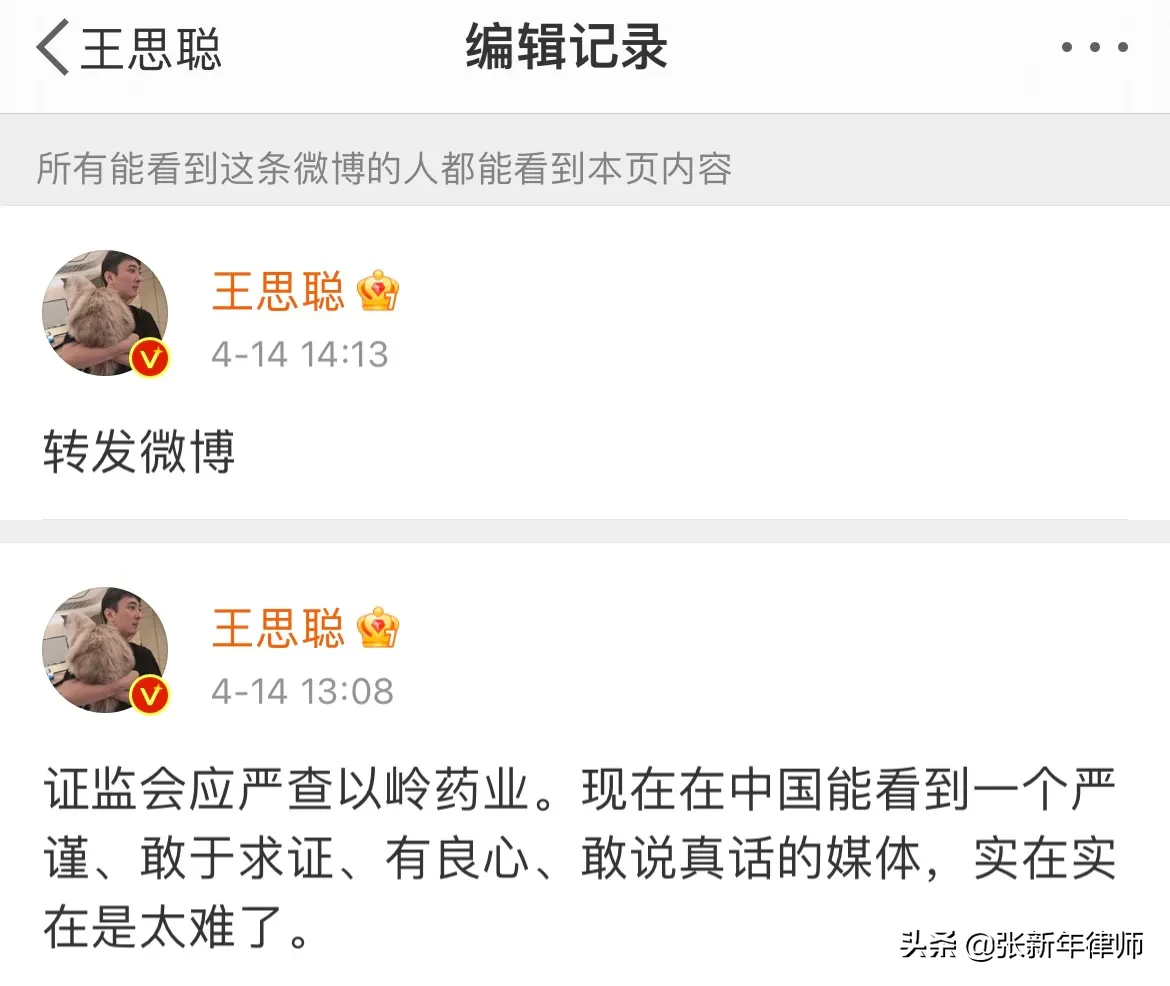 关于王思聪 ,其微博内容就两句话,第一句是其看到转发的视频内容时向主管机构提个建议,即“证监会应严查以岭药业”;第二句纯属个人感慨,即“现在在中国能看到一个严谨、敢于求证、有良心、敢说真话的媒体,实在实在是太难了”。