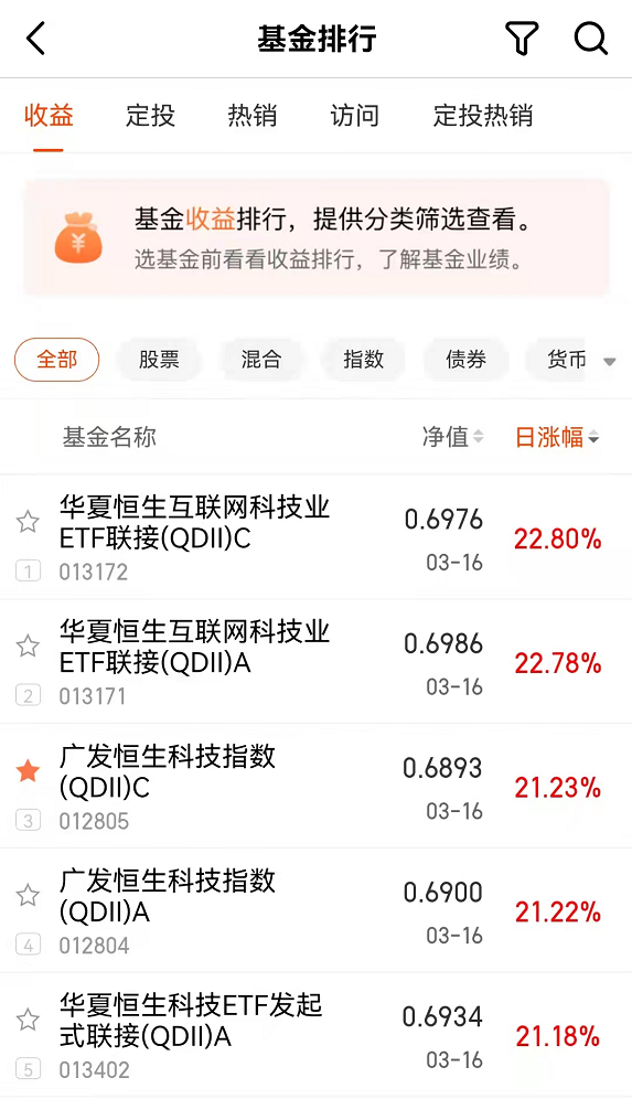 而这些基金的相同之处就是,它们都投资了港股,而以港股科技指数为投资标的的基金,更是充分受益于今天恒生科技指数全天大涨22%!