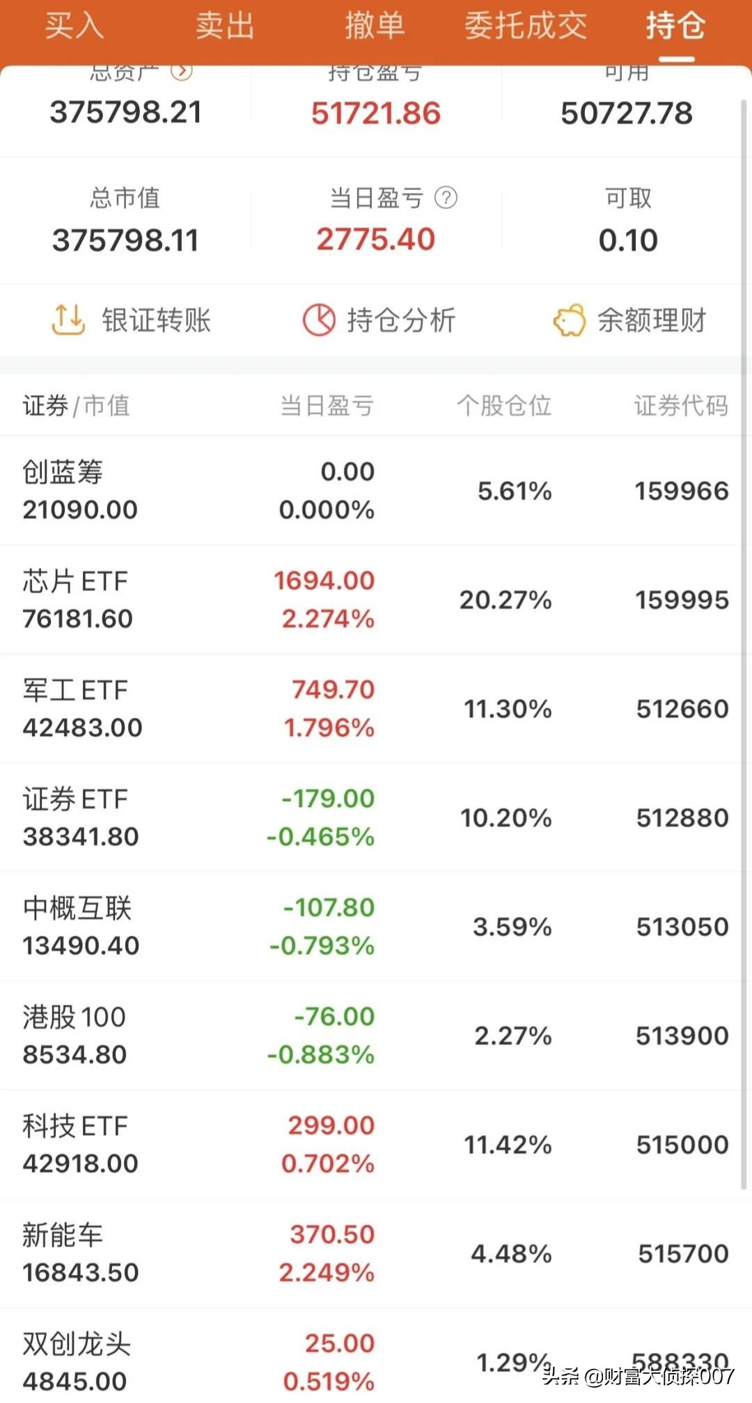 昨晚欧美股市都大跌,以为今天咱们要完蛋了!已经做好了一早上就闭眼不看盘的准备!但是三大指数大幅低开之后,深证成指和创业板指就快速拉升,显得很不服气的样子!最后,深圳成指和创业板指收涨,上证指数微跌一点。侦探哥场内ETF 今天赚2775元,最大贡献来自于芯片ETF,涨幅最大也是他,收涨2.274%!另外就是军工ETF收涨1.796%,不过今天新能车ETF反弹了,收涨2.249%,但这是止跌反弹还是诱多,还得看看!
