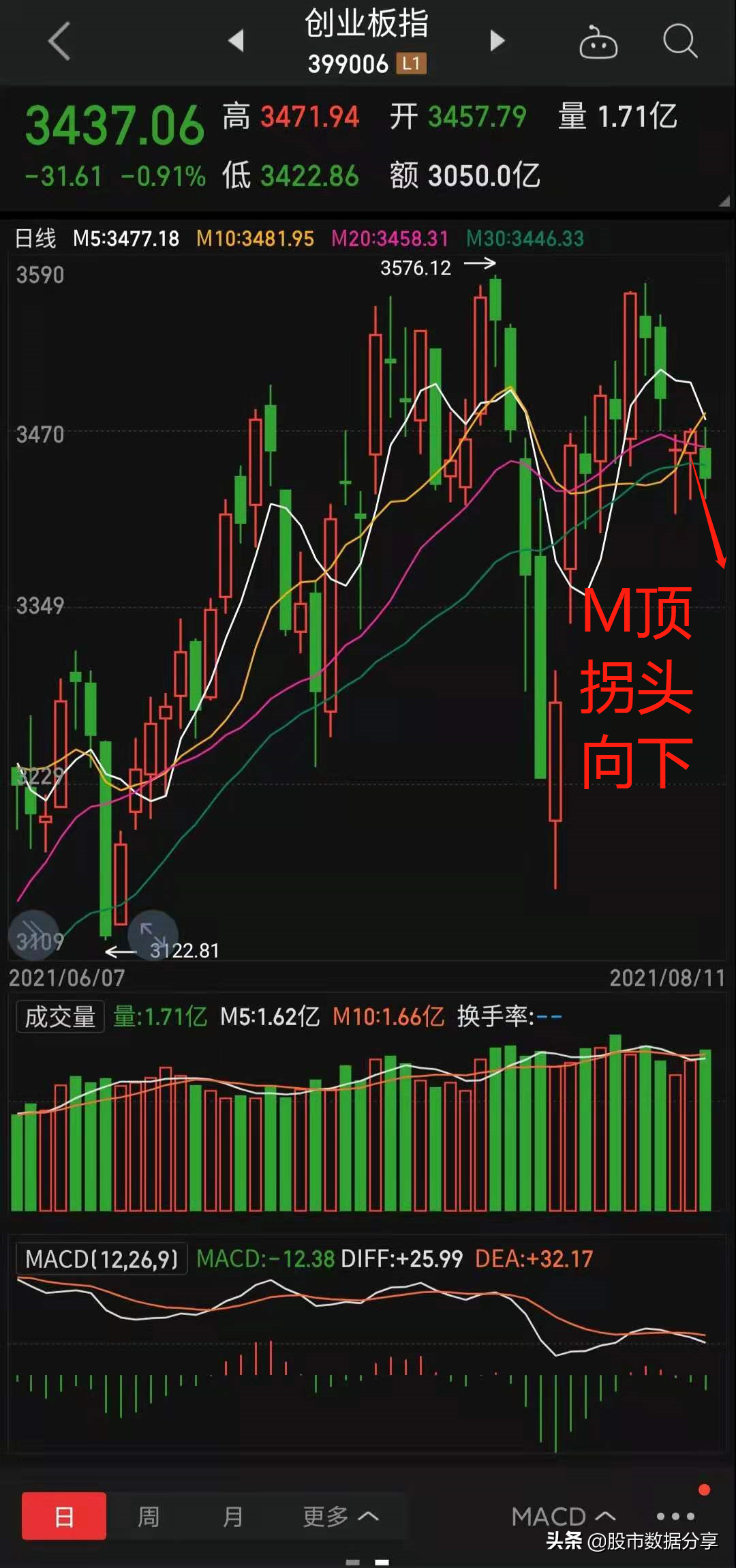 从目前的市场看,创业板走弱已经很明显了,这几天明显比上证弱,从创业板相关的权重股也能看到,宁德时代已经短期见顶,现在已经拐头向下,与创业板的走势很一致。现在看创业板的均线,短期的M顶已经成立。创业板的股票,今天与行业版块比,今天都明显走弱,所以,建议短期回避。