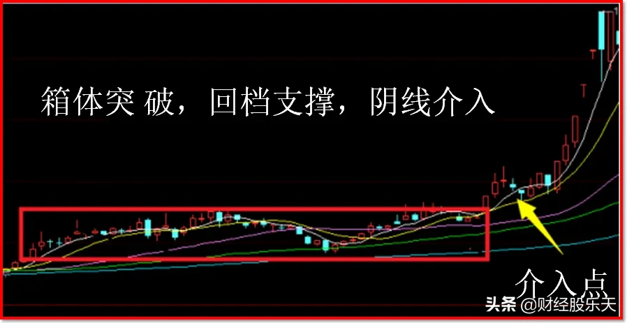 突破箱体,然后回踩箱体顶部,出现阴线才是关键点!一般突破的换手率在20%之内,出现突破放量,回调缩量,才是真正可以参与入场的时机。