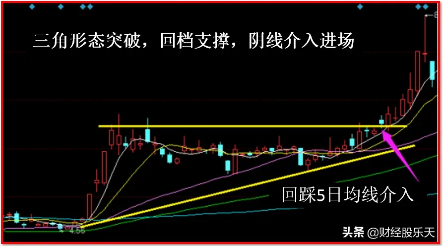 4.股价长期盘整,形成三角形突破,出现阴线回踩5日线。