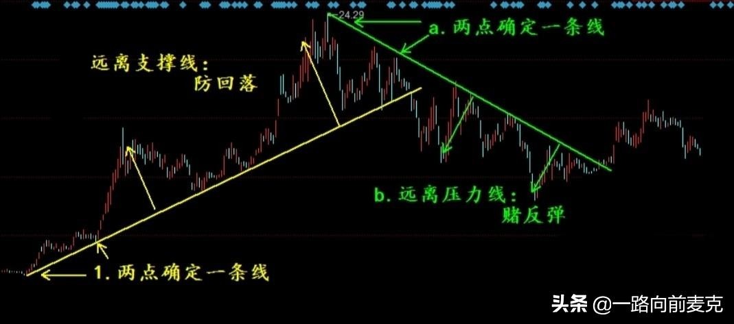3,从上至下,远离直线,短期介入,靠近直线,离场。站稳直线上方,进场。