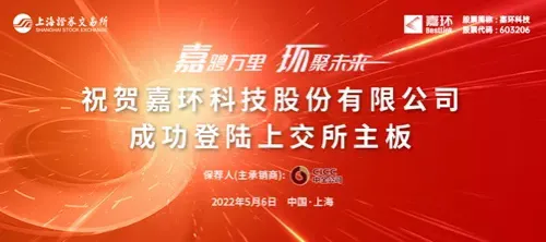 2022年5月6日,嘉环科技股份有限公司完成首次公开发行股票并在上海证券交易所主板成功上市,股票简称:嘉环科技,股票代码:603206,嘉环科技本次发行价格为14.53元/股,发行数量为7,630万股,募集资金总额约人民币11.09亿元。