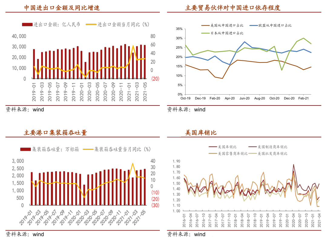 中国经济在疫情控制得力的情形下,自2020Q2开始迅速复苏,在海外疫情持续蔓延的情况下,各国对中国进出口贸易的依赖程度较为明显,我国进出口金额同比增速在2020下半年开始维持较高水平。2021年5月进出口吞吐量增速为26.9%,全国主要港口集装箱吞吐量12.5%。