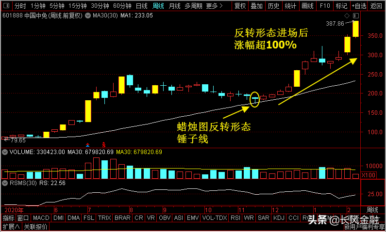 或者,当主要趋势向上,当前趋势下跌,出现蜡烛图反转信号后,我们就可以进场去做低吸,因为蜡烛图反转信号,意味着下跌趋势告一段落。进场之后,就可以把止损设置在蜡烛图的最低点下方,就比如,之前的中国中免,周线出现锤子线,进场,一波利润近100%。哪怕价格继续下跌,我们的止损也很小,只要赚的时候赚大钱,亏的时候亏小钱,我们就能够在市场上持续赚钱。