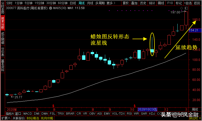 第三种,是继续延续之前趋势,英科医疗去年11月周线的流星线就是一个例子,出现反转形态后,价格继续延续之前趋势。