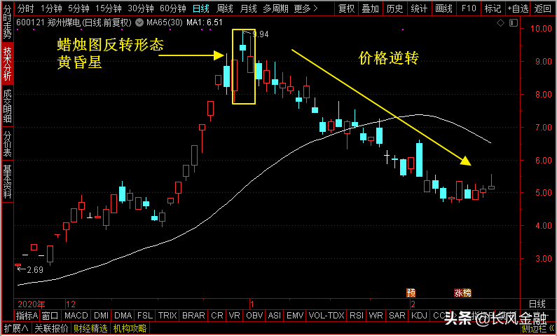 第一种,是价格直接逆转,就如同之前郑州煤电当时出现蜡烛图反转信号黄昏星的走势一样,价格直接持续跌下来。