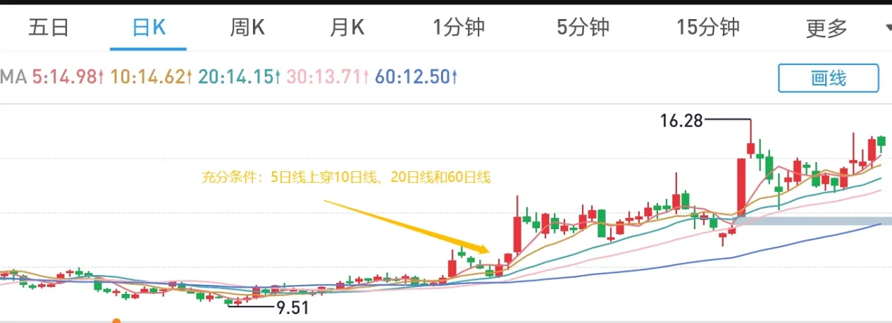 可以选择在均线从粘合在一起后刚发散的时候进场;也可以回调到5日线不破的时候进场;如果在高位就要配合量能来进场。