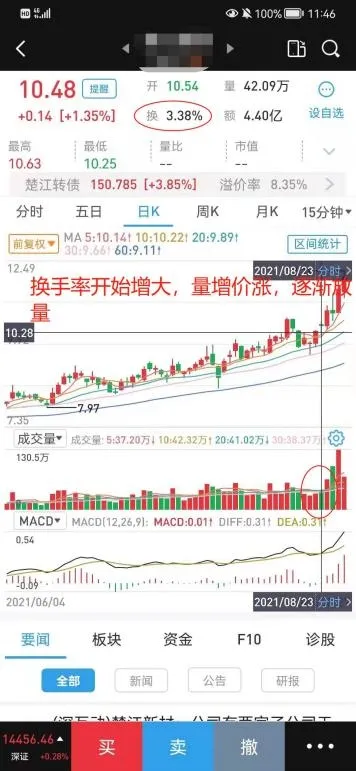 2.换手率和量能选股:K线突破横盘区域,出现持续放量的红柱,放量涨,缩量跌,上涨阶段的成交量一般不会小于横盘期的成交量。从底部启动后,K线每天创新高,即使急跌盘整也要在收盘时候拉回到昨天收盘价附近。正所谓越挫越勇,一山还有一山高。(图2)