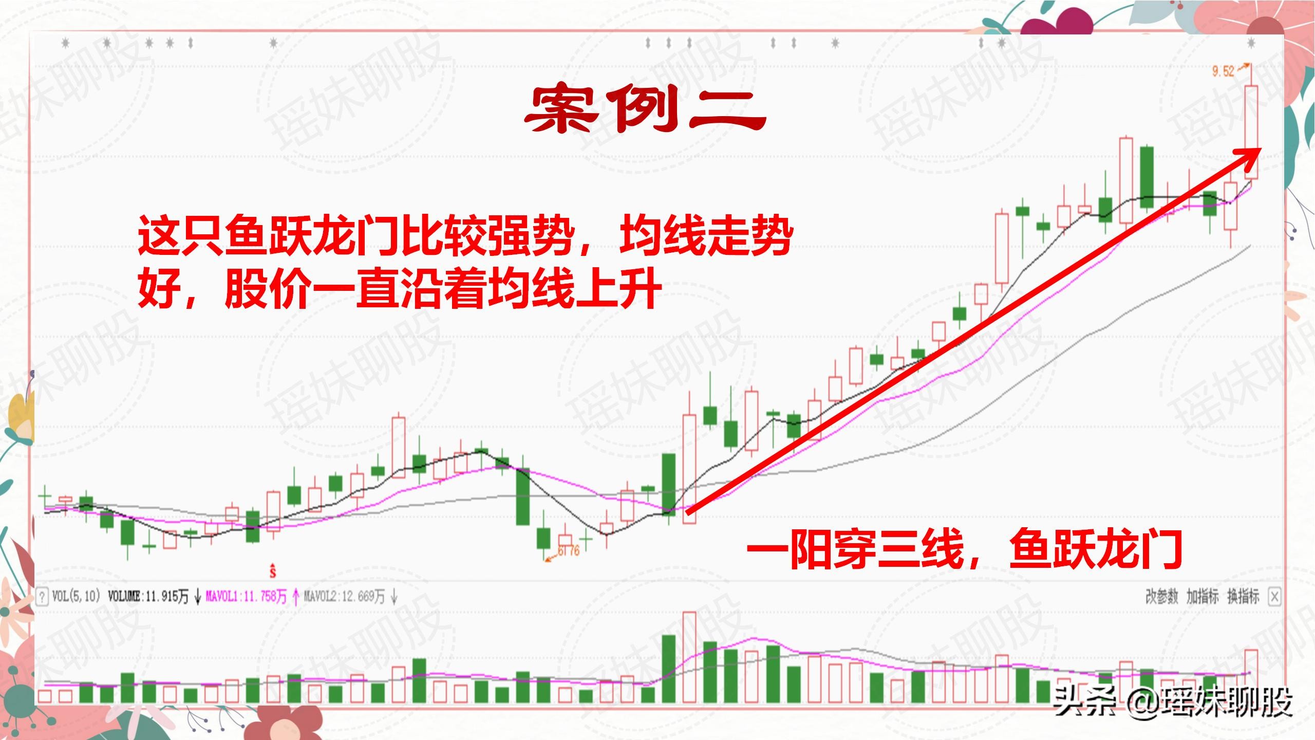 股价在经历了一段时间的调整之后,进入缩量区间,随后某一天出现一根放量大阳线,上穿五日、十日、二十日均线,形成一阳穿三线之势,股价冲过龙门,等待飞升,这就是鱼跃龙门形态。而出现鱼跃龙门形态,一般意味着股价已经基本调整完毕,主力手中的筹码也收集得差不多了,如果之后股价回踩均线不破,那么主升浪开启在即。