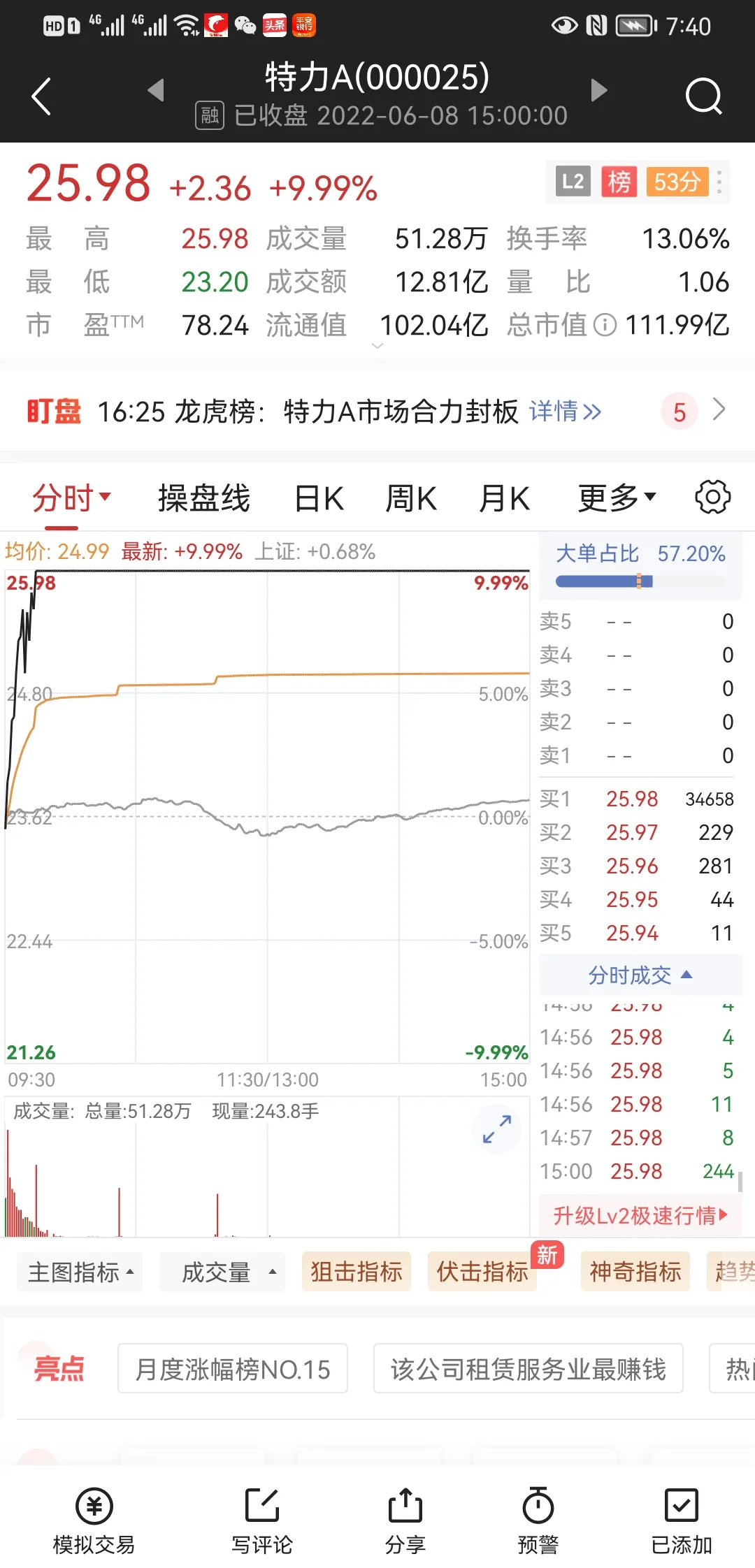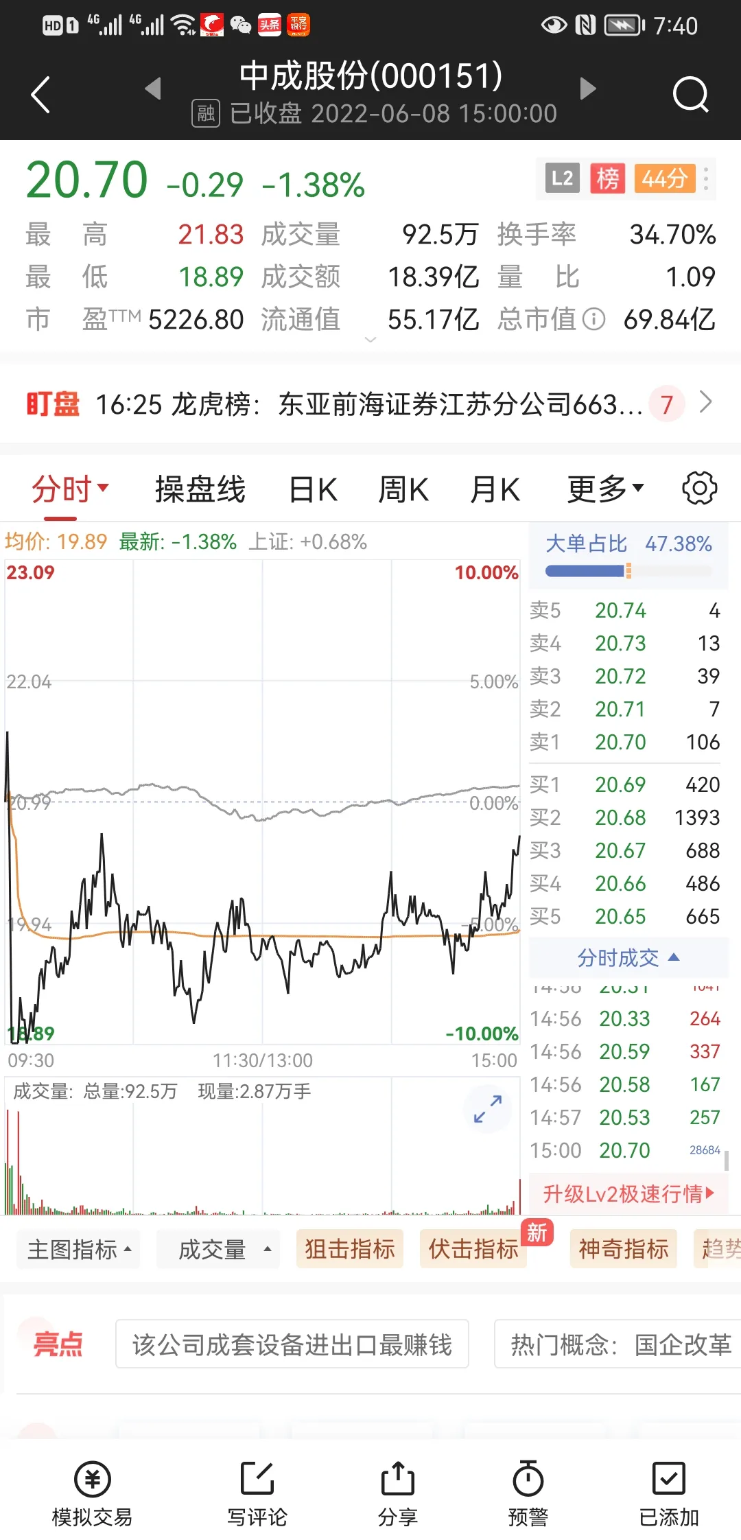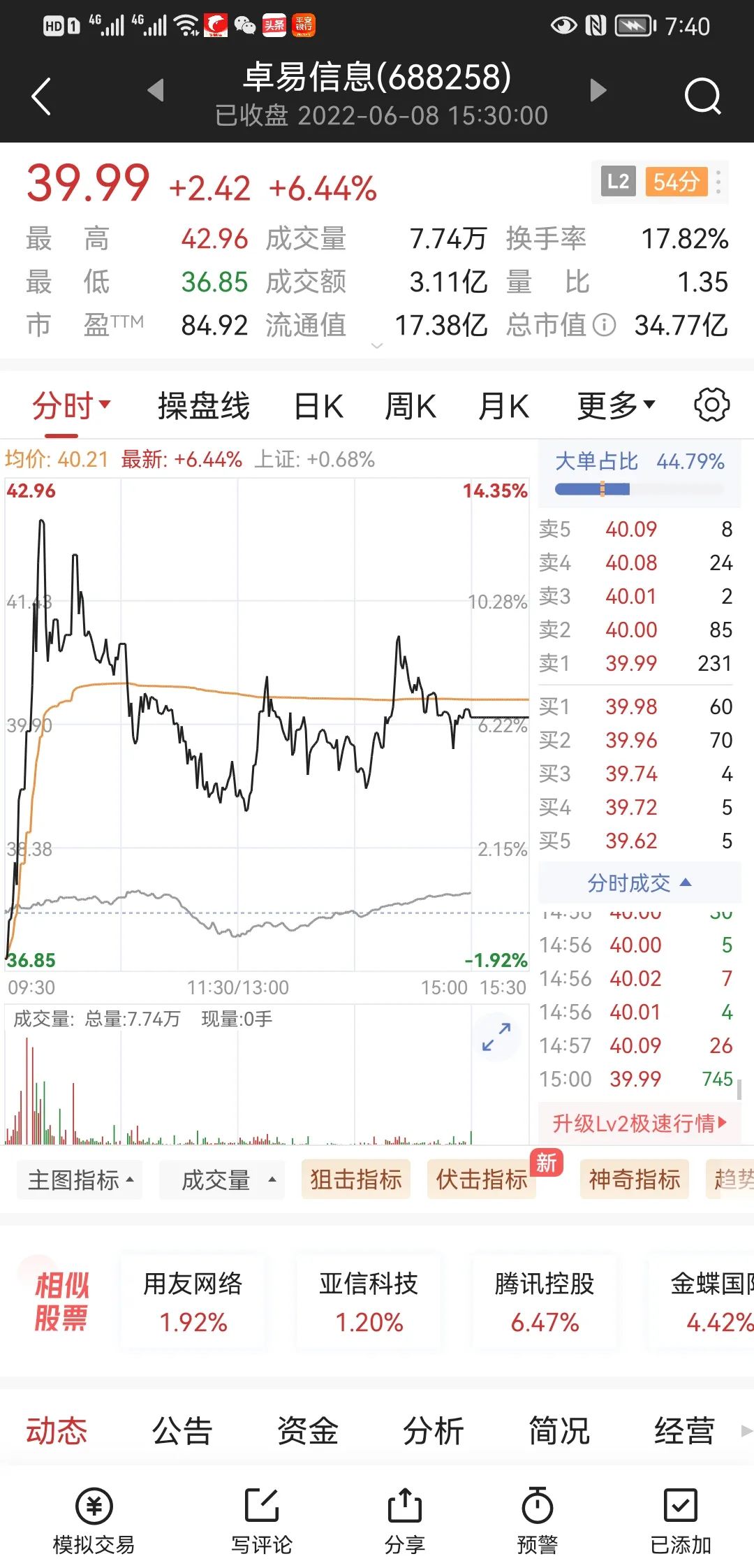 2022年6月8日,晴。又出来个超临界发电概念,我的天,整天弄这样玄乎辣鸡的名词,欺负散户看不懂,说白了,货还是那个货,上个美颜滤镜就成了香饽饽。股票炒的真谛是什么?何为价值?何为投资?何为长线短线?其实都是相对来说的,没有一成不变的理论,也没有一成不变的走势。华西能源摇身一变成了超临界发电概念股的龙头,笑不笑死人,2元钱的时候谁都不要,现在好到4元了大家拼命地抢,东西还是那个东西,只不过人为加了概念。我最感兴趣的是特力A和中成股份,满以为特力昨天地天板一早肯定被核,哪想到竟然弱转强直接拉起直奔涨停[捂脸],满以为中成昨天强势涨停今天继续高举高打,哪想到小幅高开后马上就跳水跌停[捂脸],这踏马的都是什么操盘手?!云从科技有点走弱,毫不手软,在34.6元附近清仓,保住利润。看卓易信息底部放量,在39.5元附近买进一些试盘,最高冲到42元多,有点太激进了,果然10:30回落到39元,好了又套住了。下午数源科技吃了伟哥一样,10分钟从水下拉到涨停,这个股票也是刷新了我们的认知,当你觉得他强的时候猛然来两个跌停,当你觉得他不行的时候,他又石更了,再来三个涨停,玩不了,除非不看盘。下午云从科技呼啦啦跳水,跌了10个点,好在上午跑了。中成股份在水下6-7个点震荡,到尾市竟然只跌了一个多点,强!瑞泰科技则烂泥扶不上墙,做实了跟风狗。卓易信息收在39.99,在科创板总体调整的情况下还能收上来已经难能可贵,给一个赞!