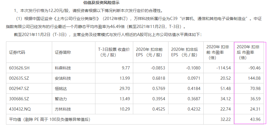 3,万祥科技,发行价12.2元,发行市盈率51.8倍,网上发行760.15万股,所属行业为C39“计算机、通信和其他电子设备制造业”。中证指数有限公司已经发布的行业最近一个月静态平均市盈率为46.49倍,可比上市公司平均市盈率43.96倍。