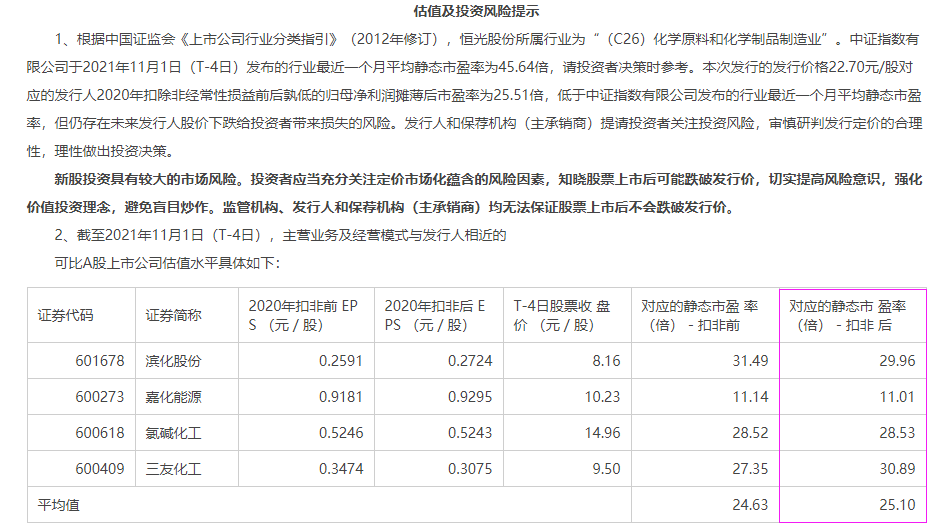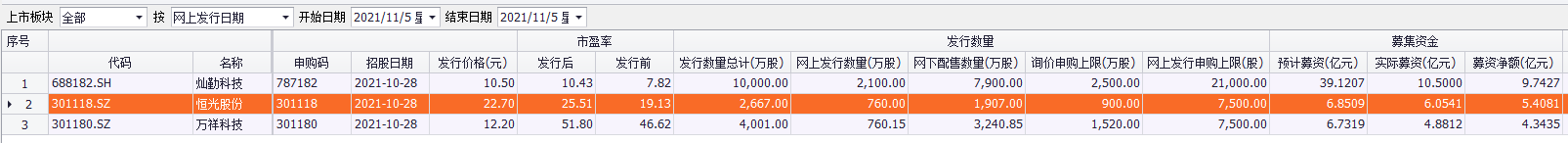 2,恒光股份,发行价22.7元,发行后市盈率25.51倍,网上发行760万股,所属行业为(C26)化学原料和化学制品制造业。中证指数有限公司发布的行业最近一个月平均静态市盈率为45.64倍,可比上市公司平均市盈率25.1倍。