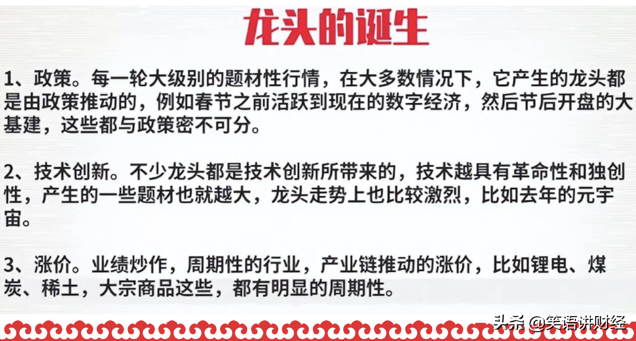 龙头股大多伴随着一个热点资讯产生,受到推动,打开想象空间,随着而来的是筹码的追逐,比如东数西算、汽车下乡等等;再有技术的创新和突破,也会来带一波炒作题材,比如元宇宙、VR等等;涨价也算一类,比如最近的硅、磷的涨价,带动相应板块异动。