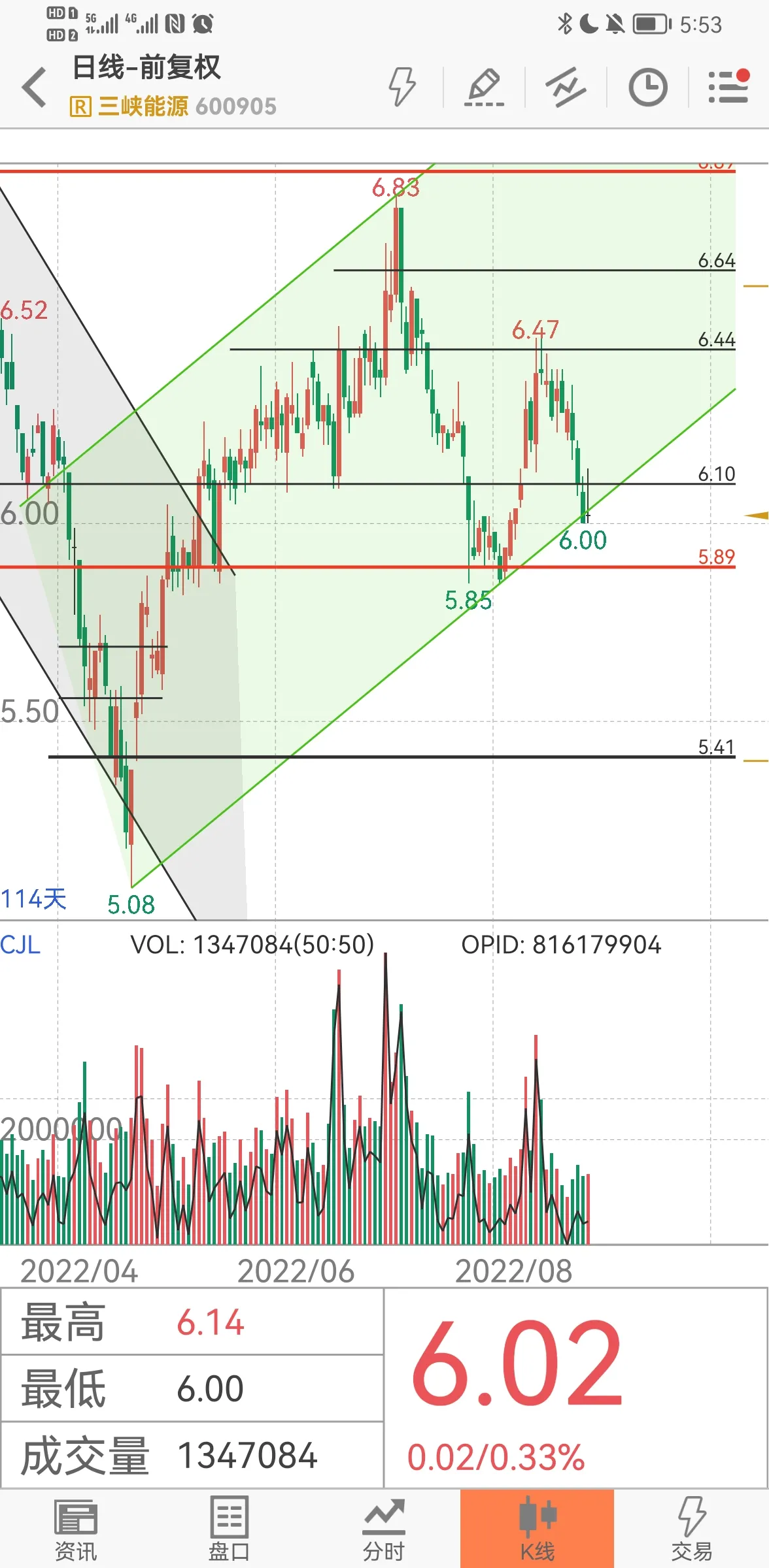 1、三峡能源,今天与预期有出入,值得关注。昨天收光脚的阴线,昨天尾盘我也进场博反弹。但收盘的光脚阴线,感觉很不好,预期今天会低开并下探5.9的。但没有,居然小高开收十字星?会是黎明之星吗?会按照我预期的宽幅通道上行吗?期待下周的分解