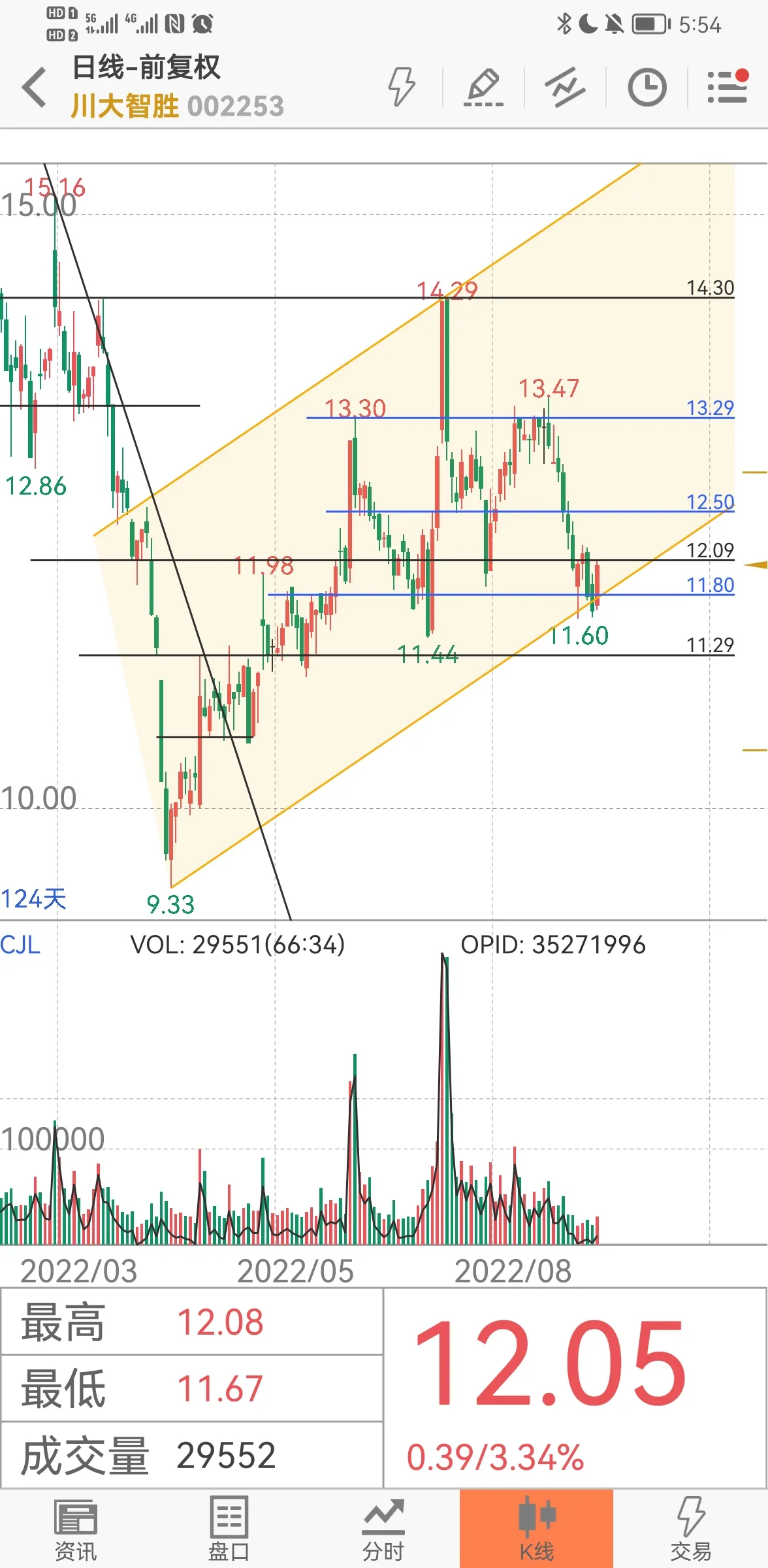 2、川大智胜,本轮下跌回调中,我从12.5附近开始抄底,可惜被埋了。但一方面是底部的支撑,一方面是第六感觉——总感觉和国机重装有异曲同工之神韵。所以虽然抄底的仓位暂时浮亏,但心里还是比较淡定,特别是今天的分时图,盘中一度感觉似曾相识,和7月19日感觉有点像。当天有发文,随后第二天涨停。不期待下周一涨停,感觉下周会有个拉升,是否会回到13元附近呢[嘘][嘘]