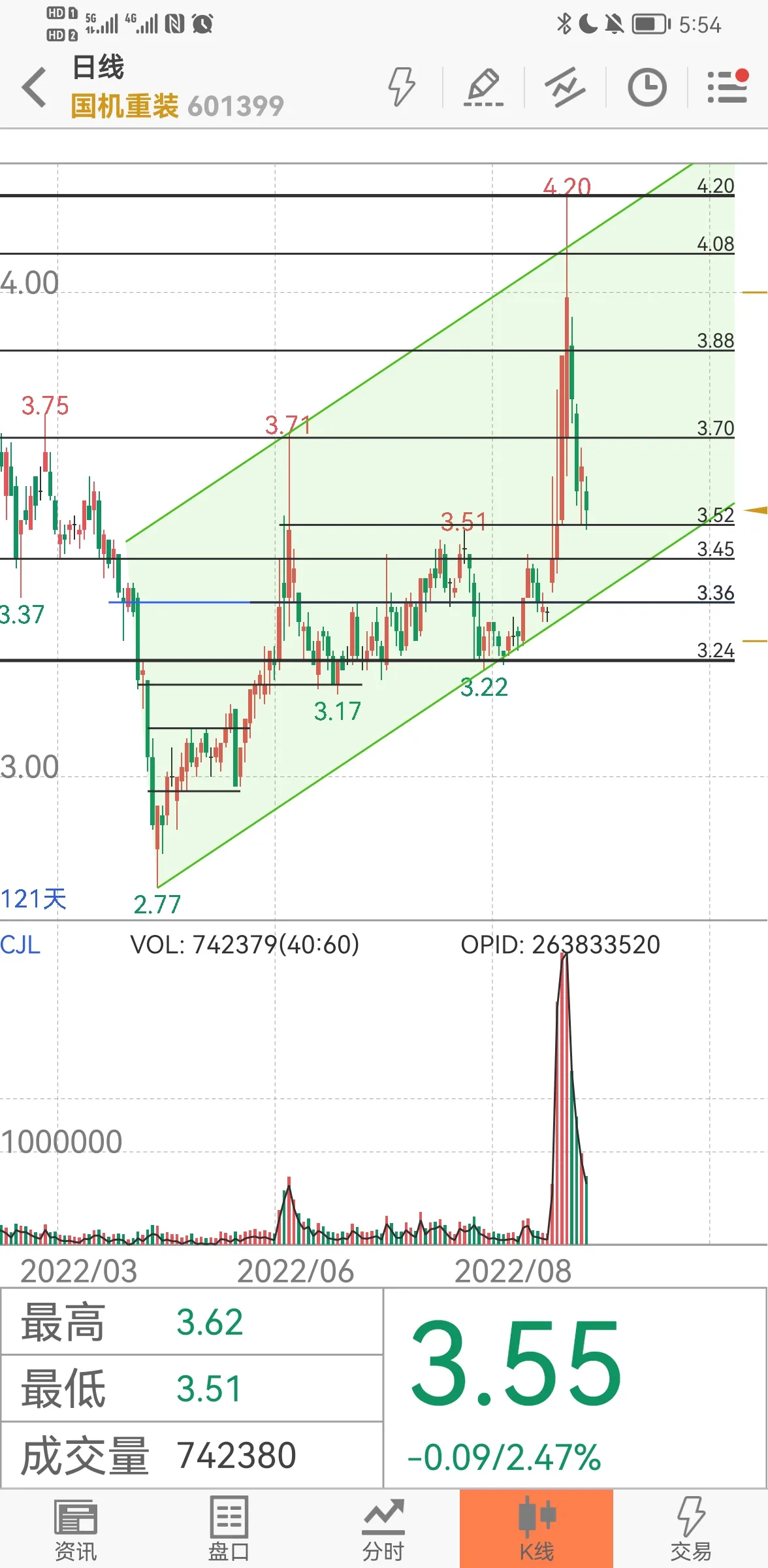 3、国机重装,目前只留了2层底仓。之前的预期是到3.52有支撑。昨天和今天都有所印证。是否有效呢?下周跟踪观察。但当前不是入场时机。前面这么大的爆量,主力洗盘和再度吸筹,没有个一两个月时间,估计不会拉升。如果9月中旬还能守住这个支撑,那把握就越来越大。月底不跌破的话,就考虑再度择机逢低入场了。下一轮目标博突破4.2