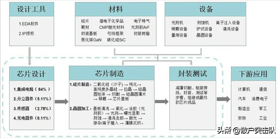简单地说,就是设计方通过设计软件把芯片图纸先设计出来,然后再通过设备把提前准备好的材料按照设计出来的图纸加工成半导体,最后封测公司把芯片封装起来测试性能,然后成品芯片流入工业、手机、汽车等领域,所以整个环节。