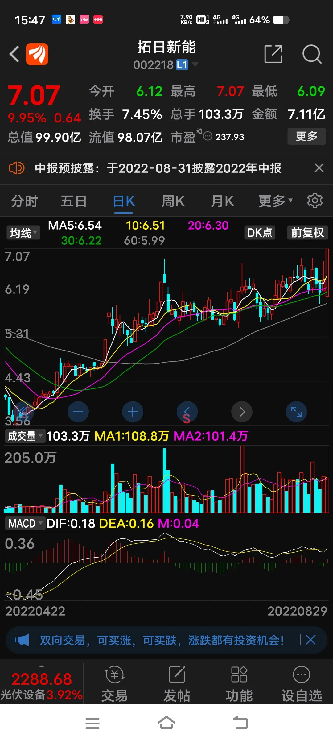2022.08.29 周一交易总结: