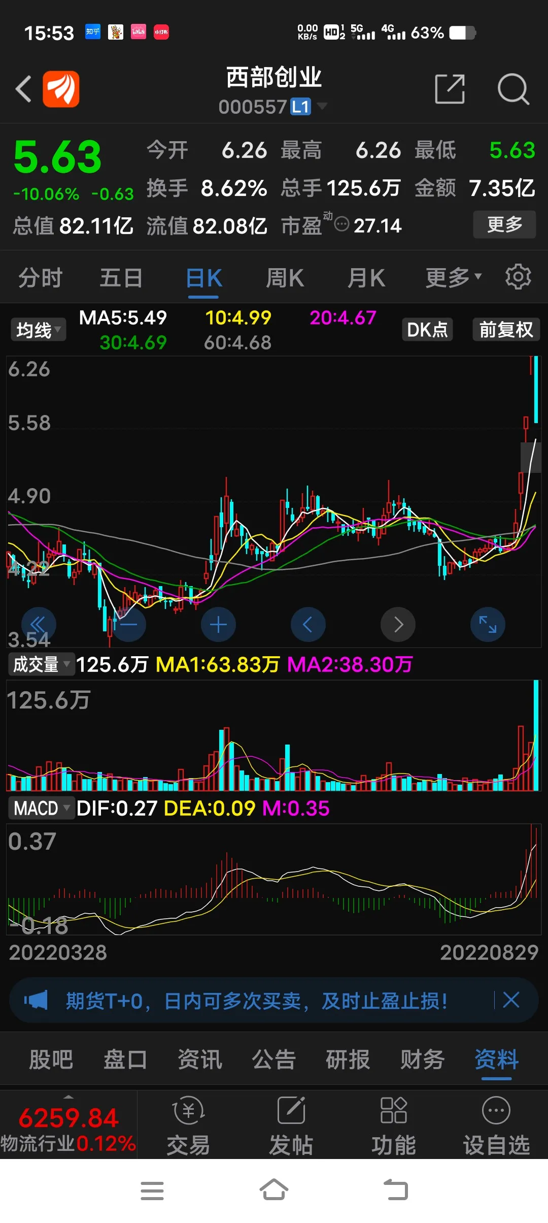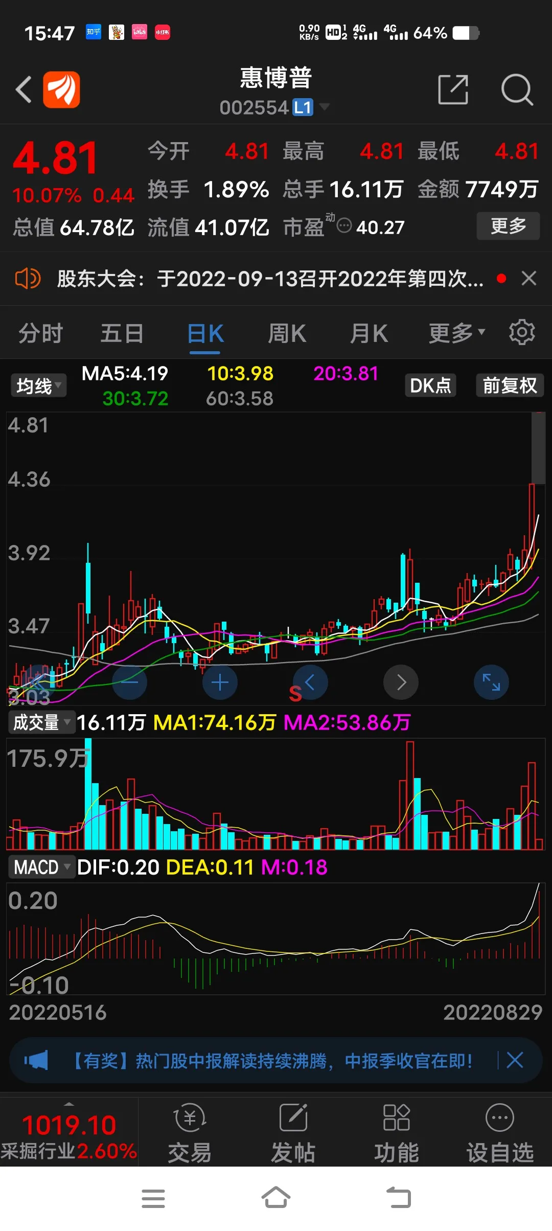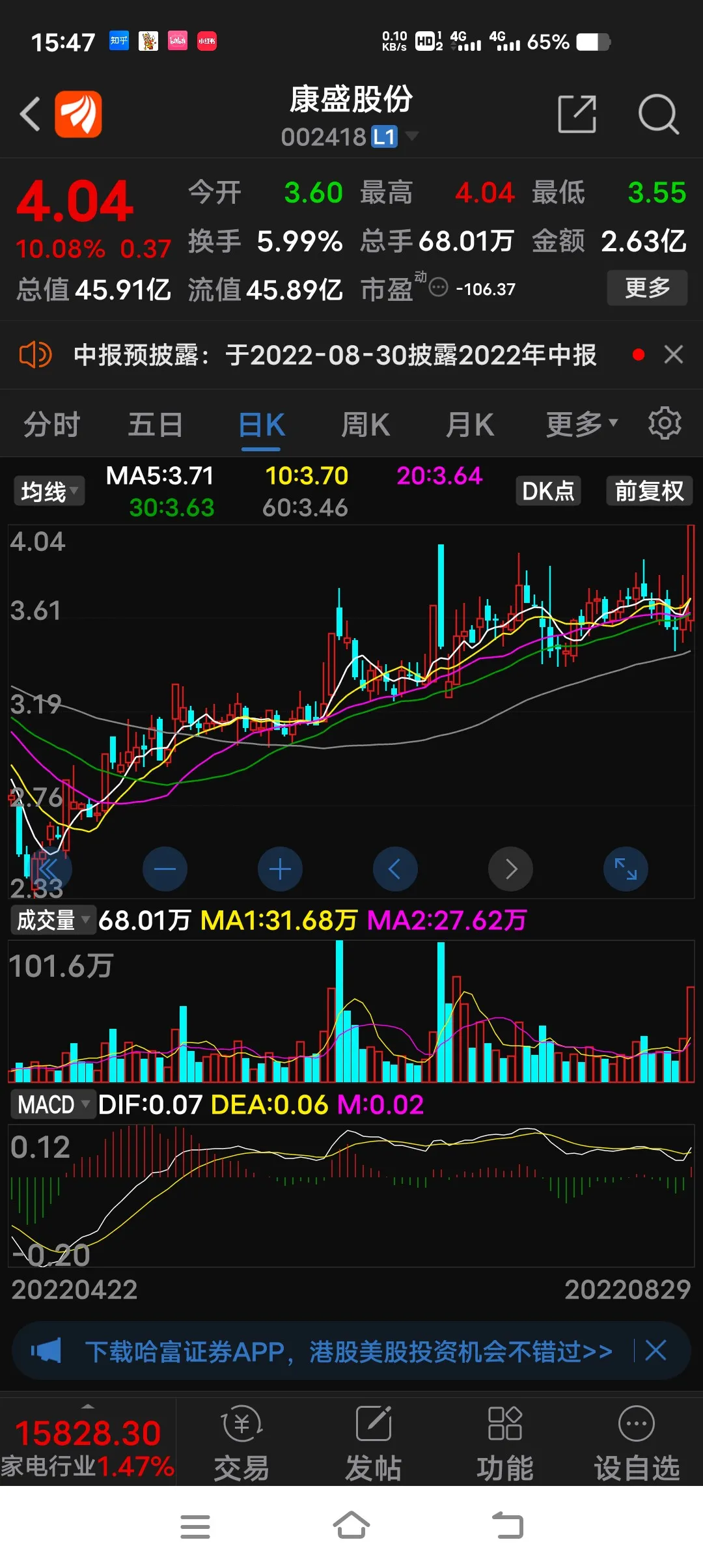 周五早盘先是以3.65元高抛(可惜没有在最高点),继而以3.58元低吸,做T成功,午后终于涨停,浮盈6个点。